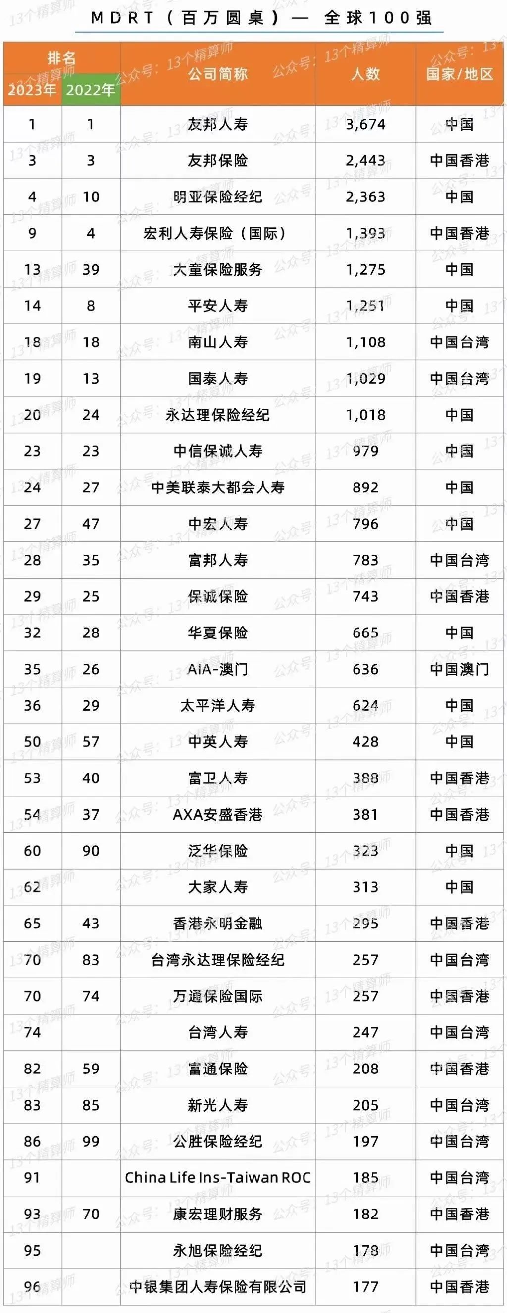 2023年全球寿险MDRT排名已揭晓。