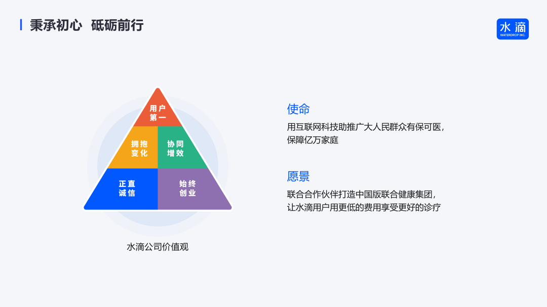 第一个原因是水滴的文化,水滴的企业使命“用互联网科技助推广大人民群众有保可医,保障亿万家庭”,不正是我作为一名保险从业者内心一直在追求的终极目标吗?这种独特的企业魅力深深地打动了我。