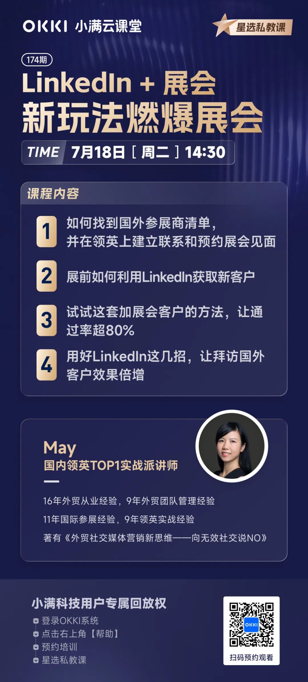 小满云课堂最新推出周二【星选私教课】,7月起陆续上线第二期「OKKI开发系列课——领英开发课」,带你玩转领英,轻松高效获客!