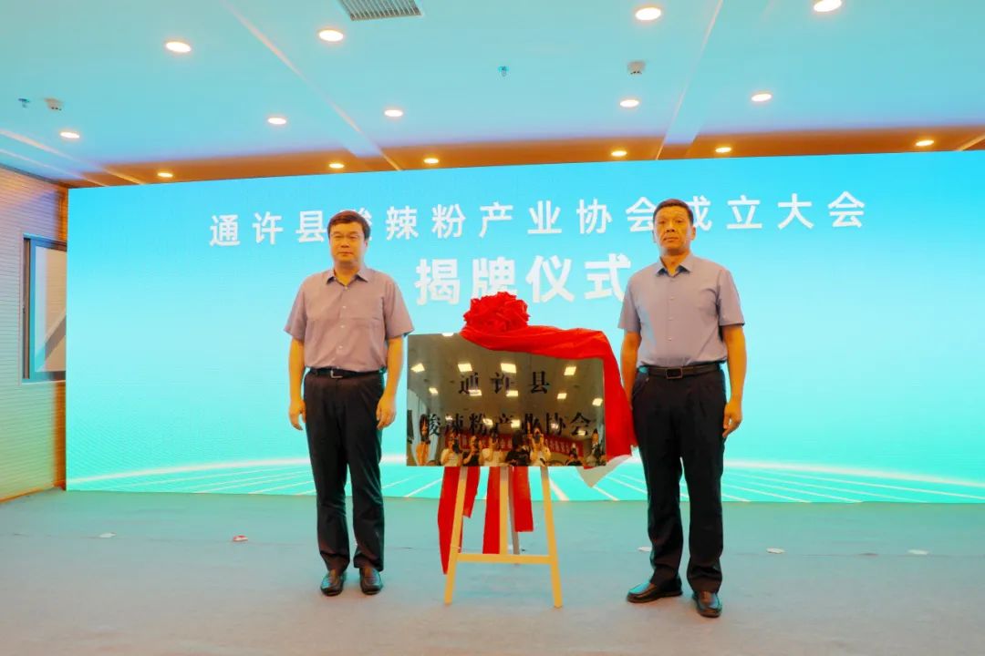 沈志勇与通许县酸辣粉产业协会会长、丽星亿源食品总经理宗国强共同为通许县酸辣粉产业协会揭牌。