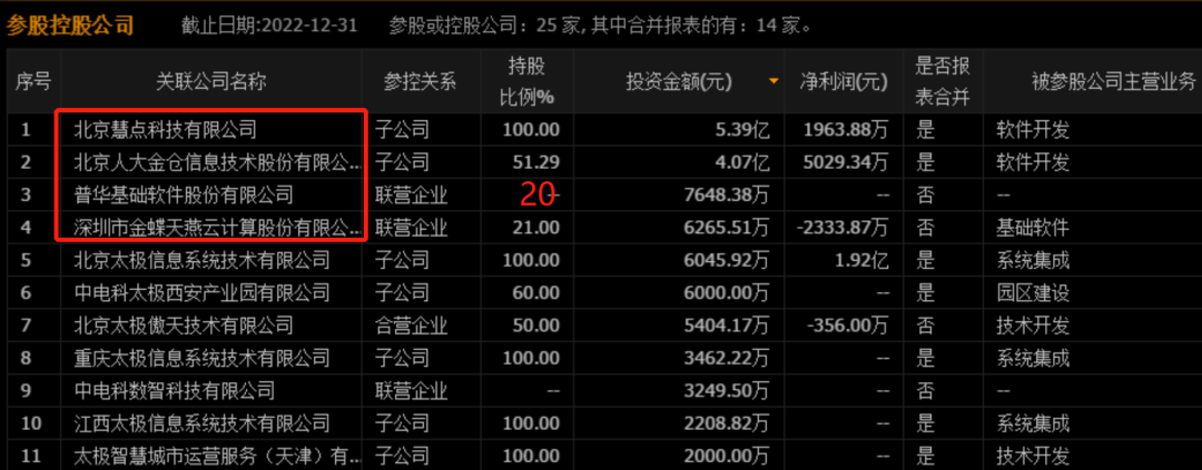 近年来,太极股份坚持以“数据驱动、云领未来、网安天下”为核心战略指引, 主要业务包括:云服务、网络安全与自主可控、智慧应用与服务和系统集成服务。“云服务”主要是指面向国家政务、智慧城市和重要行业提供云计算和数据运营服务;“网络安全与自主可控”主要包含网络安全、内容安全、信息系统安全以及自主可控基础产品及服务;“智慧应用与服务”主要是指面向“互联网+政务”、 “互联网+行业”等提供以大数据、人工智能、区块链等智能技术应用为主的技术服务;“系统集成服务”主要是指围绕定制化解决方案提供的咨询、系统集成、产品增值服务以及系统运维服务等。其布局过程为:1)数据库方面:2011 年,太极股份战略投资人大金仓信息技术股份有限公司,成为其第 二大股东,着手布局国产数据库(金仓数据库)。2017 年,继续增资成为控股股东。2021 年,再次增资 2 亿元实现绝对控股,持股比例上升至 51.3%;2)办公软件方面:2013 年,公司整合并购北京慧点科技股份有限公司 91%股权,开始布局企业管理软件。2019 年,公司再次收购慧点科技剩余股权,慧点科技成为公司的全资子公司;3)中间件方面:2015 年,公司战略投资金蝶天燕中间件有限公司,持股比例 21%,着手布局国产中间件软件;4)操作系统方面:2021 年,公司收购普华基础软件股份有限公司 20%股份,成为其第二大股东,布局操作系统业务(普华软件主营操作系统业务,可以提供桌面操作系统、服务器操作系统、实时嵌入式操作系统、汽车电子AUTOSAR操作系统全线产品和解决方案)。至此,太极全产业链数字化拼图完成,现在的年收入已超过百亿规模。