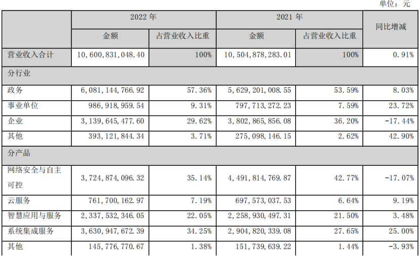 四大块主要业务中,网络安全与自主可控和系统集成服务各占1/3、云服务占7%、智慧应用与服务占1/5;如果某国禁止向我们提供云服务业务,那么这一块无疑将会有所增长——不过竞争也挺大的。