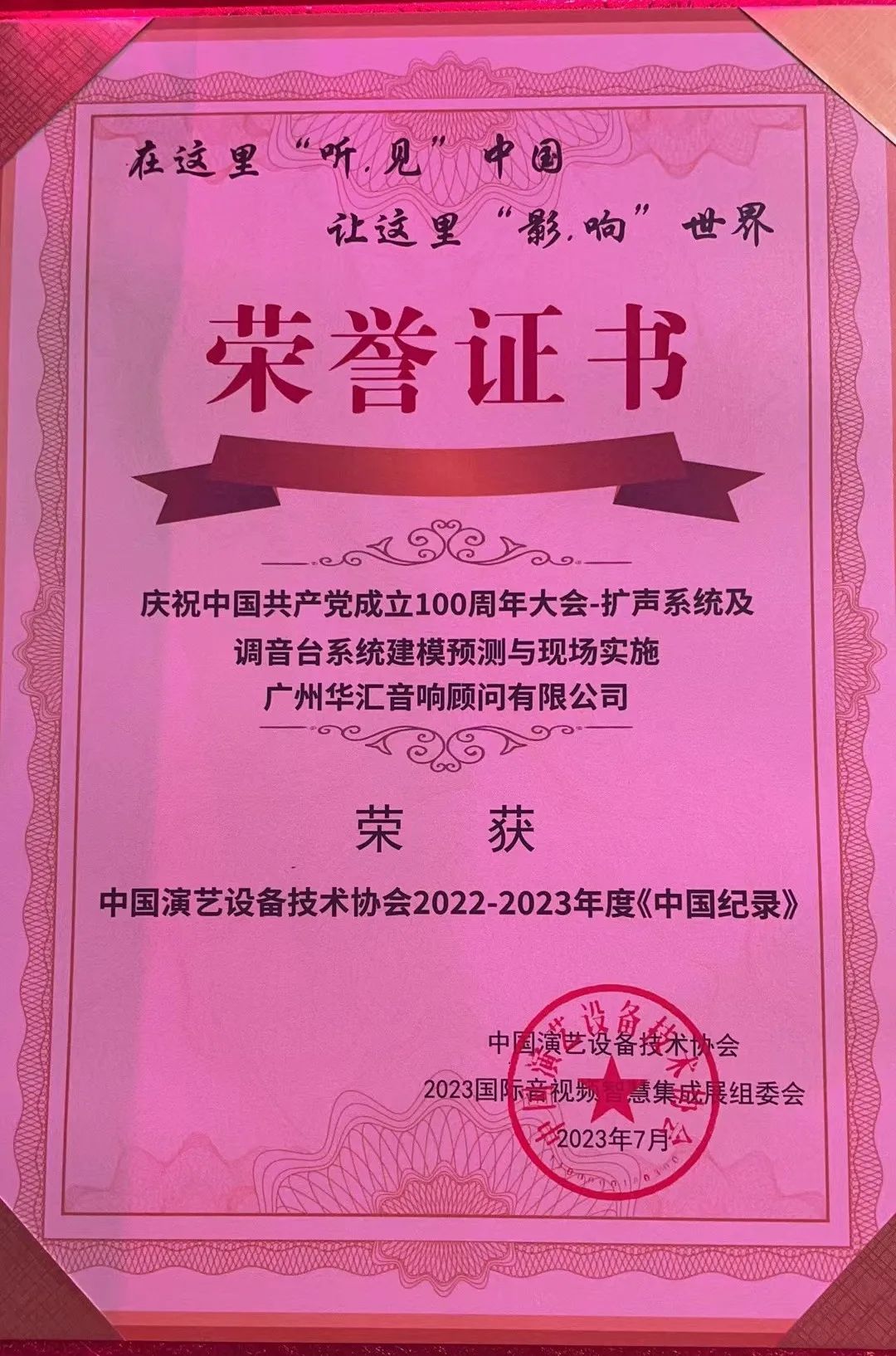 除了有论坛分享之外,《中国纪录》奖项也是重要的一环,《中国纪录》的目的是守正创新,打造我国演艺装备行业的吉尼斯。共有16家企业获奖,其中,华汇音响顾问有限公司的《庆祝中国共产党成立100周年大会-扩声系统及调音台系统建模预测与现场实施》,荣获中国演艺设备技术协会颁发的2022-2023年度《中国纪录》证书。