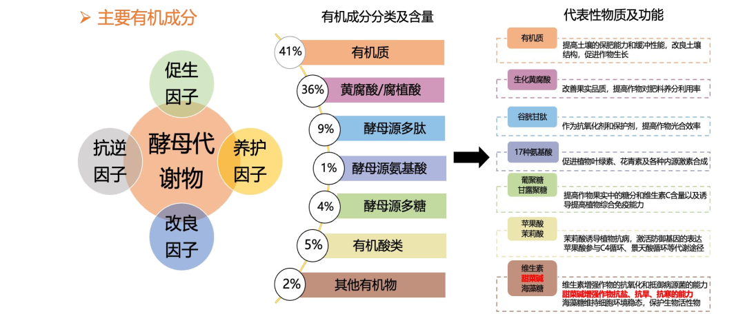 酵母代谢物中的酵母多糖、氨基酸、多肽、有机酸、甜菜碱等生物刺激素对促进作物生长,调控植物生理代谢,提高作物抗逆,提升农产品风味,具有广阔的市场前景。