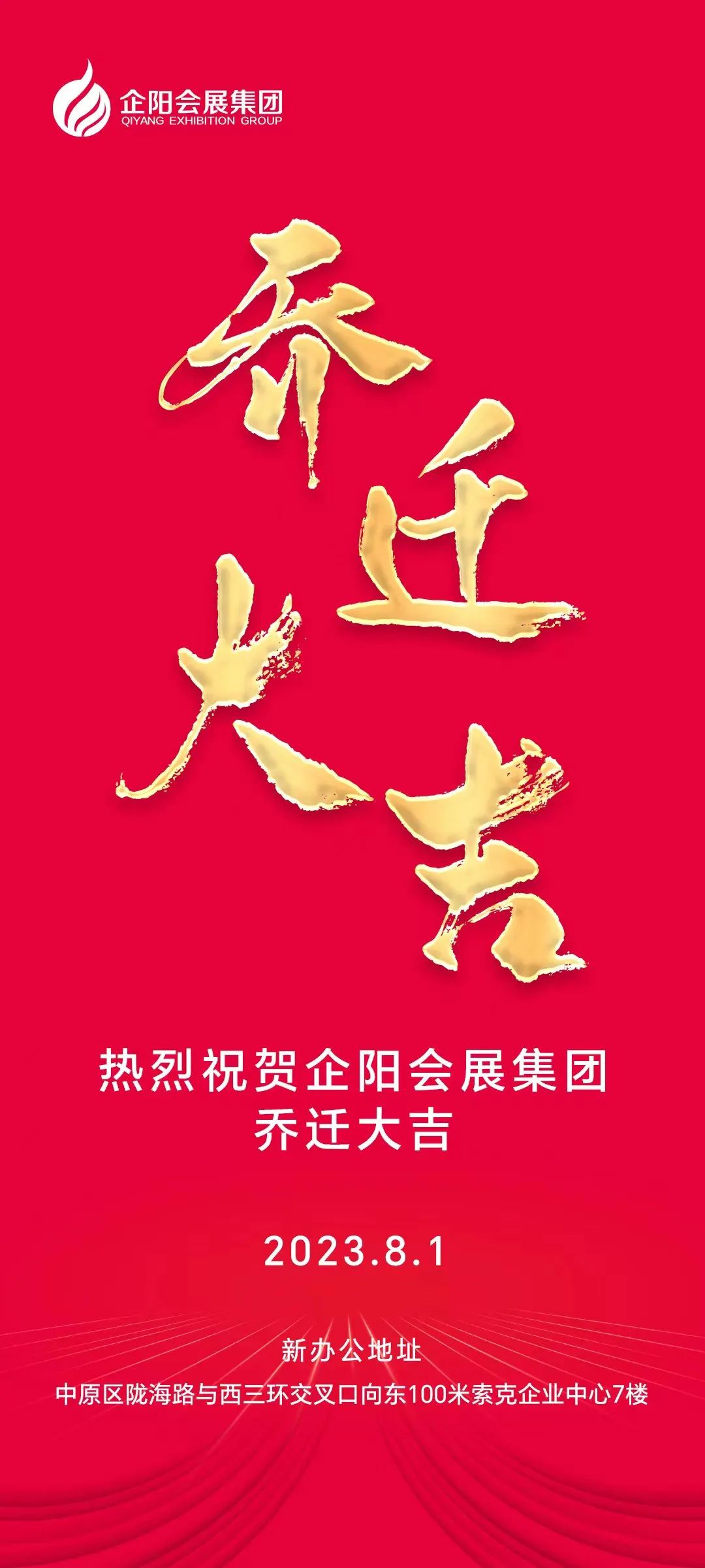 新办公室乔迁至郑州市中原区陇海西路379号索克企业中心7楼 ,办公面积比以往提升一倍以上,新的空间,明亮、宽敞,也充满了无限可能。今日(8月1日)吉时,企阳会展集团在新址隆重开业,迎来新的起点,掀开新的篇章。