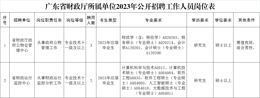 广东省财政厅所属政府公物仓管理中心、运行监控中心本次共面向社会公开招聘工作人员5名,具体招聘岗位情况详见下图↓↓↓