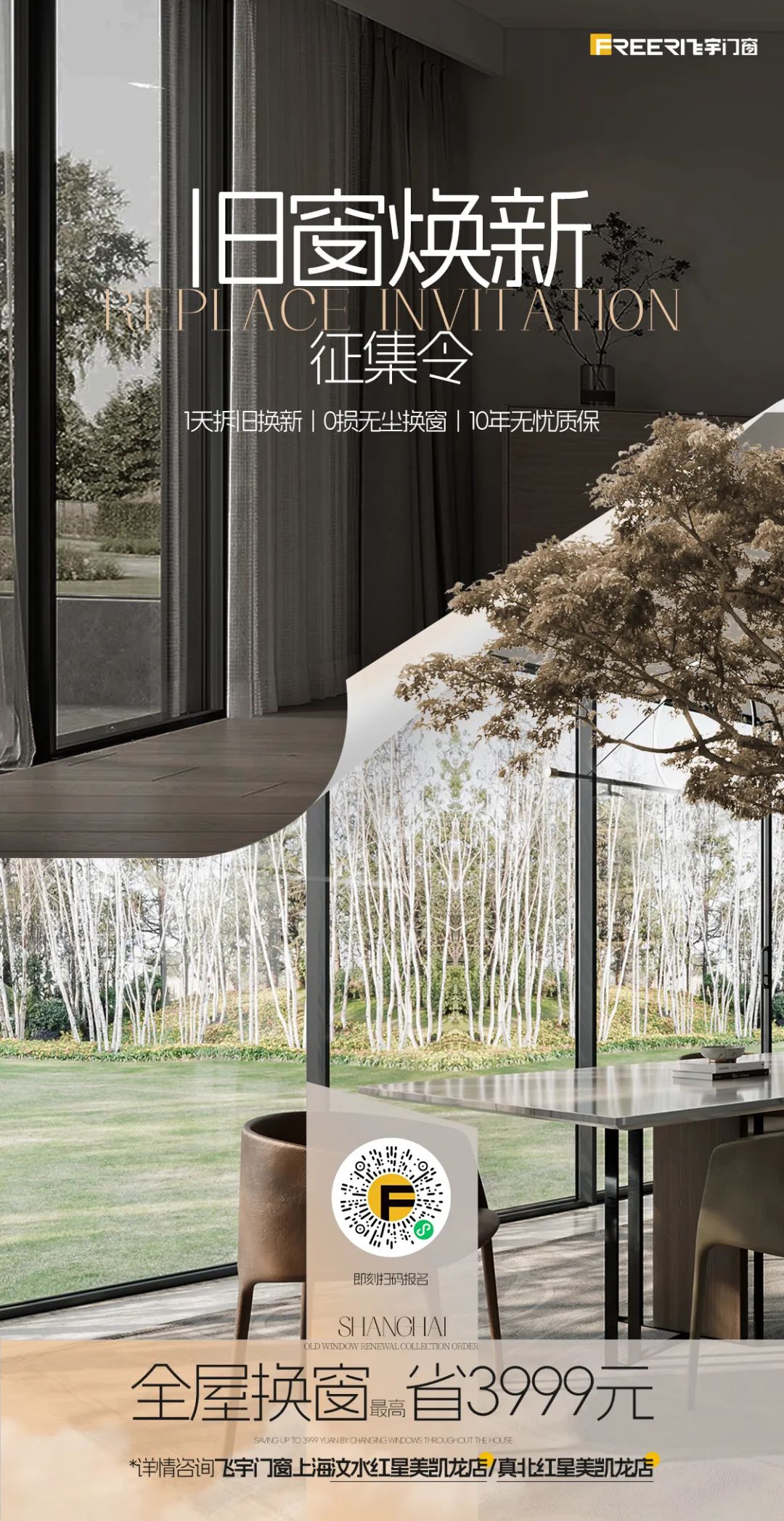 门窗帮作为飞宇后端安装硬实力,在保证产门窗品质的前提下,用专业且高效的后端安装技术,让门窗在1天时间内焕然一新。品质门窗+专业安装,双重BUFF将门窗发挥到最大价值。为此,会上公布飞宇旧窗焕新政策最高省3999元,立即扫码报名,让你的家完美逆袭。