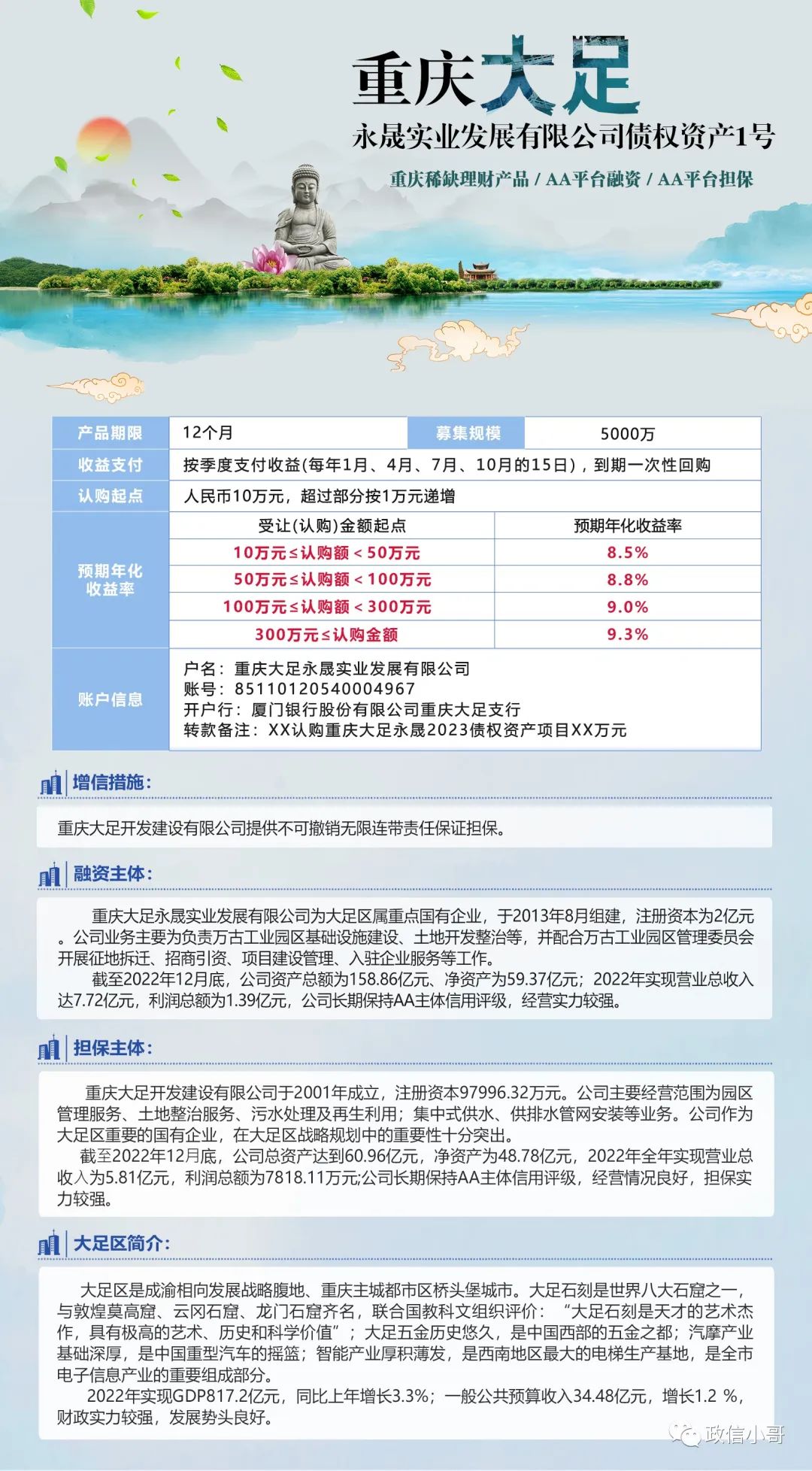 【融资主体】:重庆大足永晟实业发展有限公司为大足区属重点国有企业,于2013年8月组建,注册资本为2亿元。公司业务主要为负责万古工业园区基础设施建设、土地开发整治等,并配合万古工业园区管理委员会开展征地拆迁、招商引资、项目建设管理、入驻企业服务等工作。截至2022年12月底,公司资产总额为158.86亿元、净资产为59.37亿元;2022年实现营业总收入达7.72亿元,利润总额为1.39亿元,公司长期保持AA主体信用评级,经营实力较强。