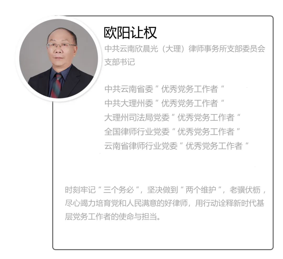 7月27日,全国律师行业党委在北京召开律师行业党建工作先进典型表彰会,云南欣晨光(大理)律师事务所专职书记欧阳让权荣获律师行业“优秀党务工作者”称号。