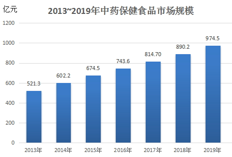 根据观研天下数据(图1),2013年我国中药保健食品市场规模为521.3亿元,此后稳步增长,2019年市场规模达974.5亿元。中药保健食品使用得最多的原料是灵芝孢子粉、灵芝、铁皮石斛、人参、西洋参、鹿茸、黄芪、当归、党参、天麻、肉苁蓉等十余种。其中,灵芝孢子粉保健食品已实行备案制管理,党参、灵芝、铁皮石斛、天麻、肉苁蓉、黄芪、西洋参等保健食品常用原料正在进行药食同源试点。乐观估计,2019年药食同源类保健食品占中药保健食品市场份额的比例达1/3,即药食同源类保健食品市场规模超过300亿元。