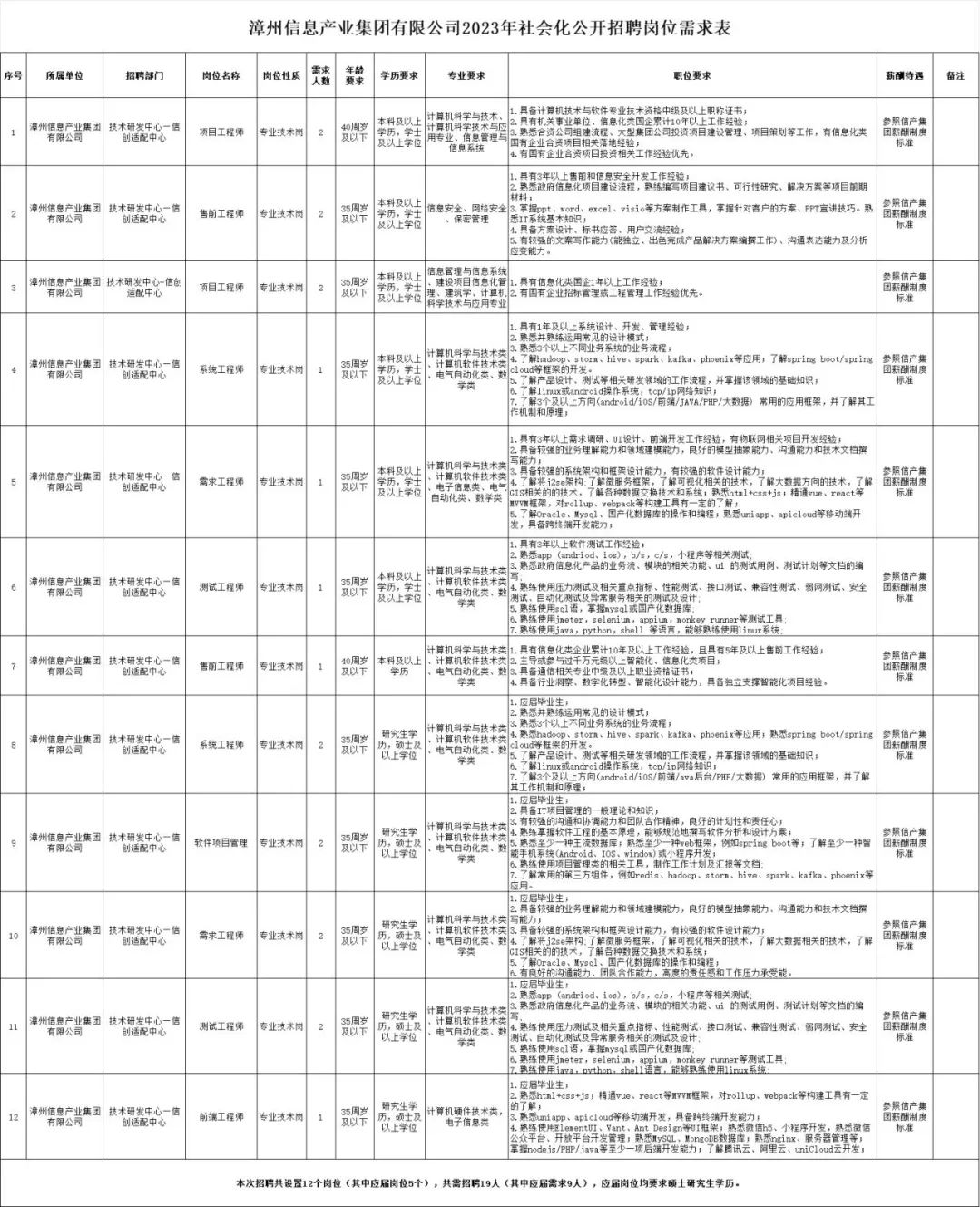 1.本次招聘设12个技术类岗位,详情可见附件1《漳州信息产业集团有限公司2023年社会化公开招聘岗位需求表》。