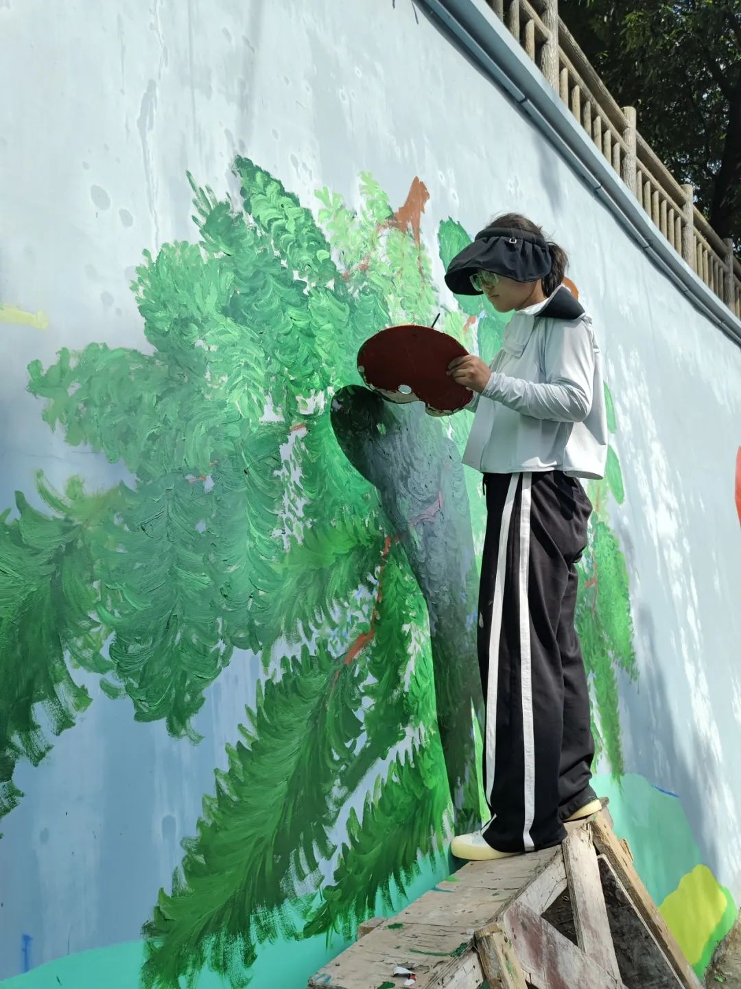 在公淤村,实践团充分调研了解公淤香榧产业未来发展规划后,以“公淤古榧,榧香万里”为主题,不断打稿、勾线、上色,一颗颗栩栩如生的香榧树跃然“墙”上,在为乡村添加了一道靓丽的风景线的同时也为公淤香榧农产品宣传起到了很好的作用。