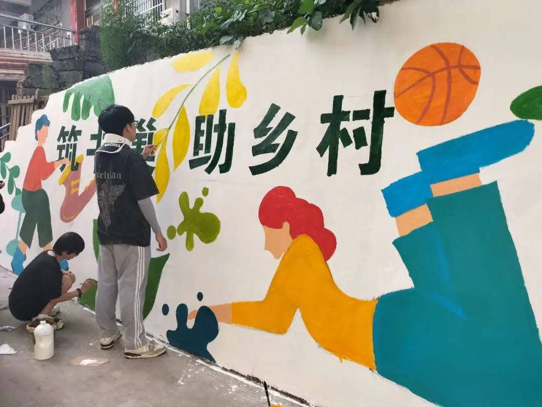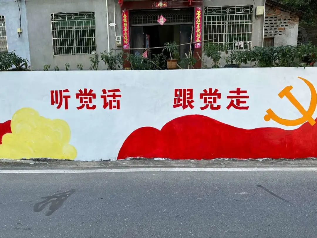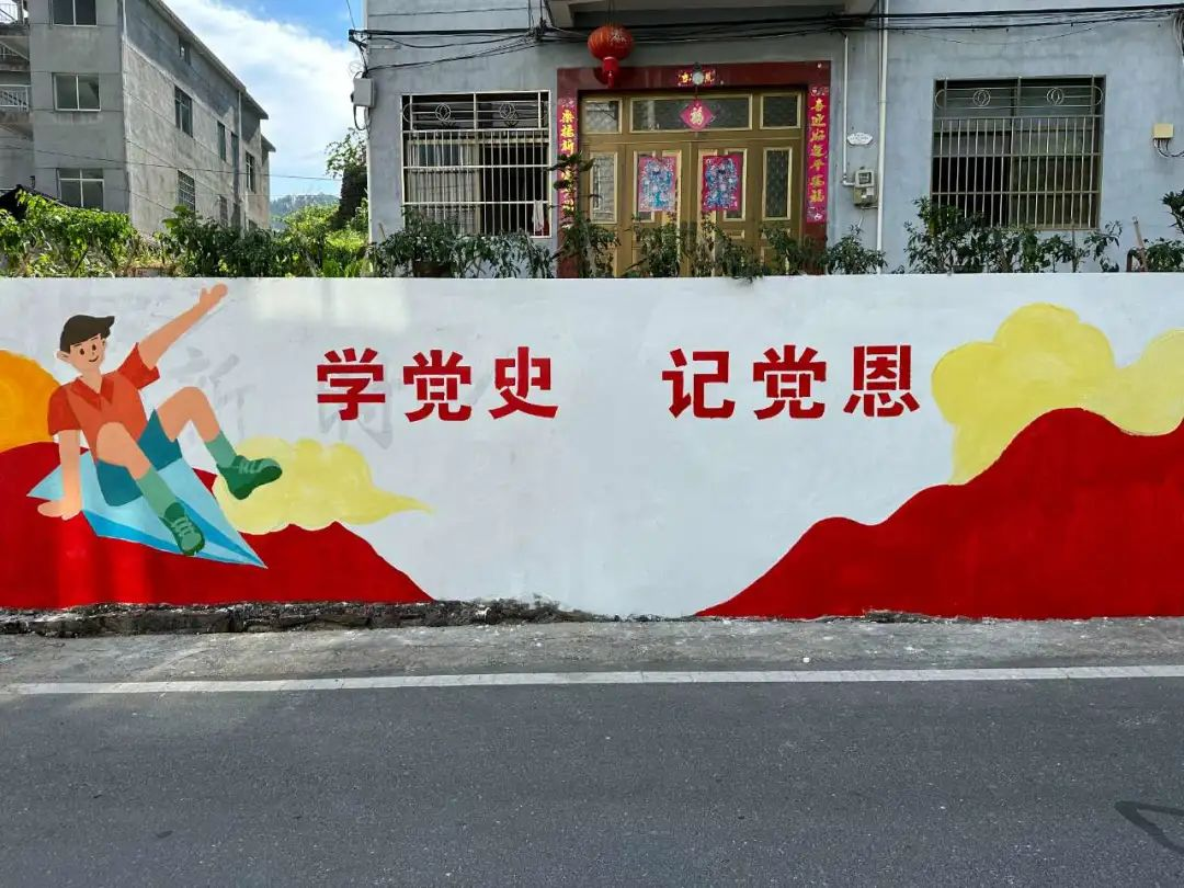 传承红色基因,全面共促乡村振兴,实践团在方田村以党建文化为主题进行墙绘,融合国际化特色,将党建文化以村民喜闻乐见的方式将党的声音传递到基层,为乡村振兴谱写美丽篇章。