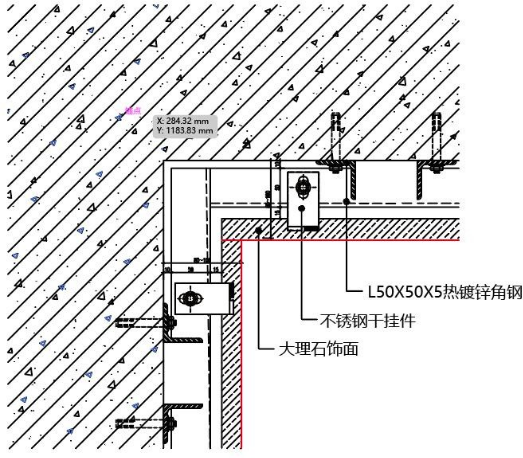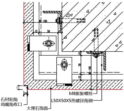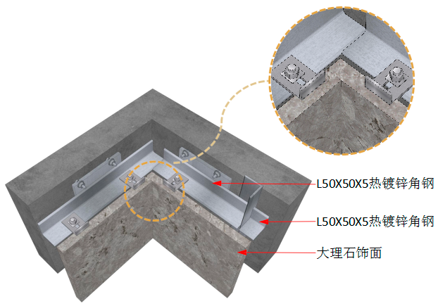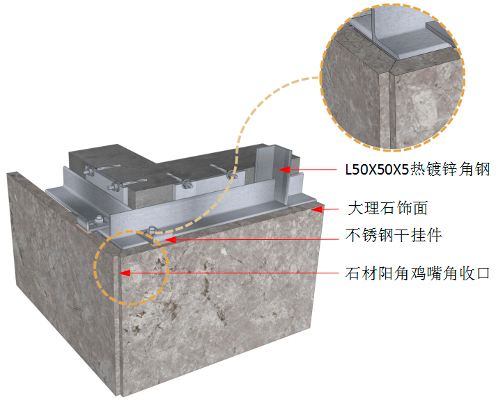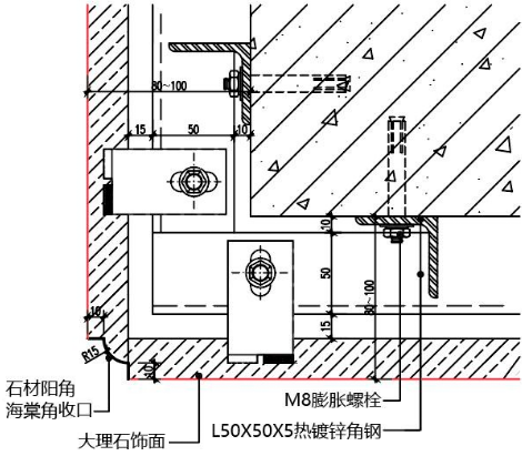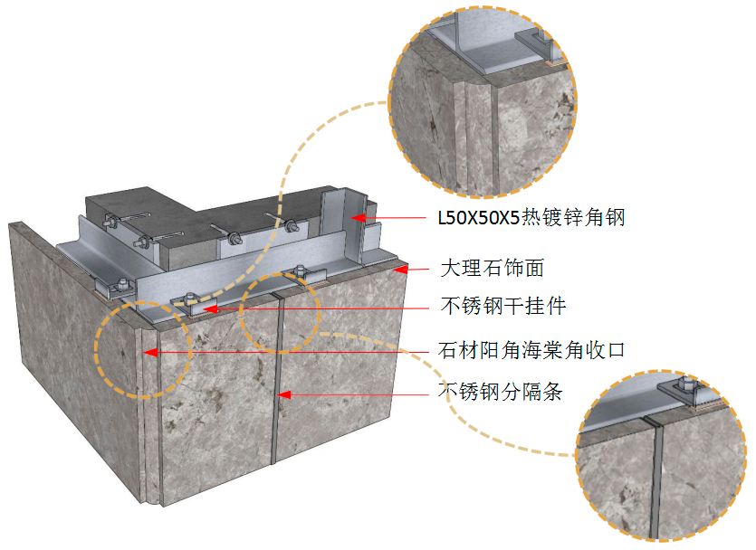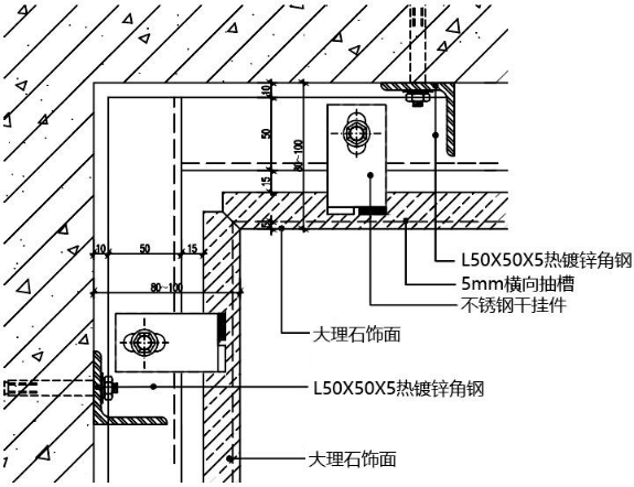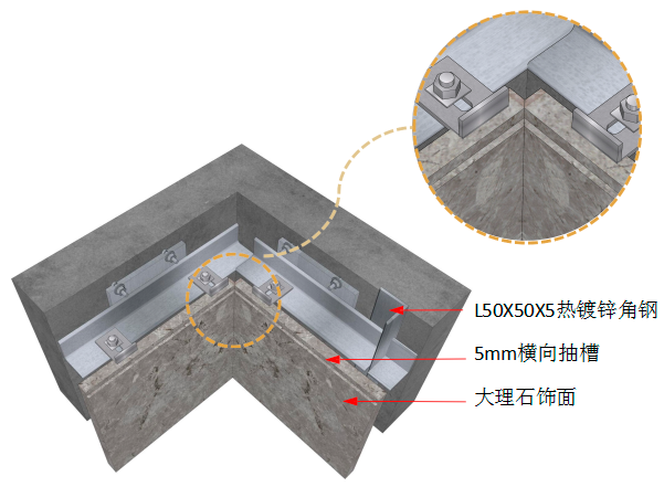 此节点为石材横向抽槽 5mm U型槽时,采用阴角45°对拼节点, 可保证阴角石材无空洞。