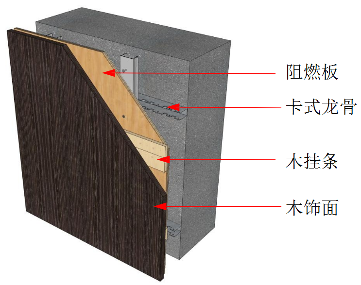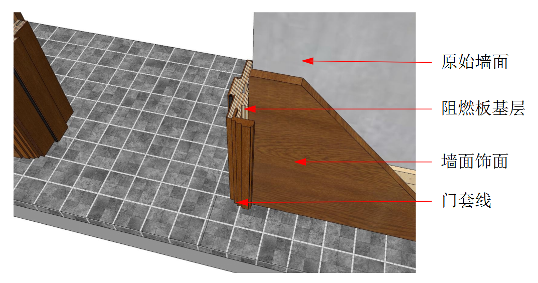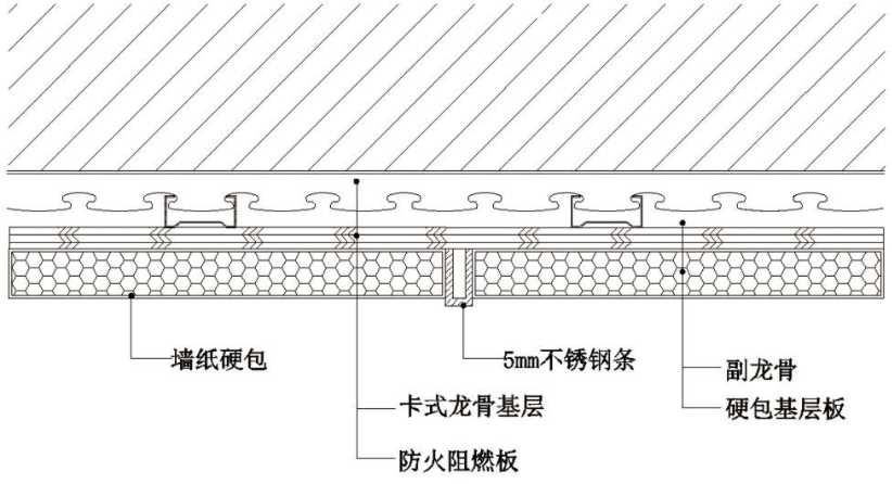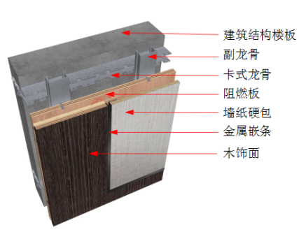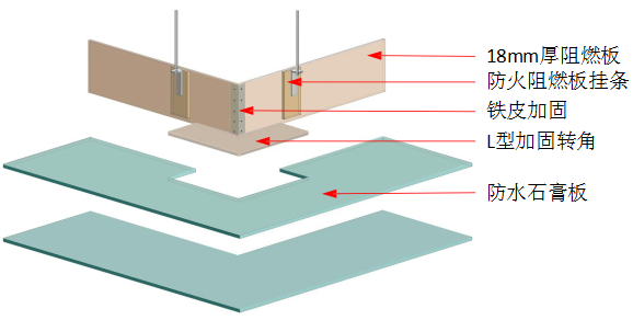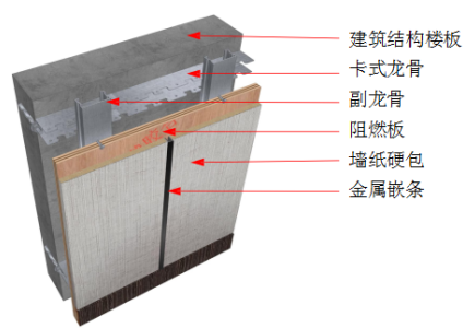 ② 安装基层衬板:封板前应确保基层内机电等管路施工完毕,并通过验收。基层板采用12㎜阻燃阻燃板,均做防腐防潮处理;板与板拼接处留3-5㎜缝;安装时从上往下自里向外;