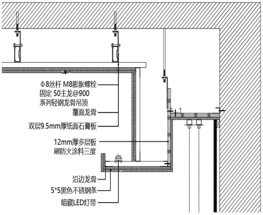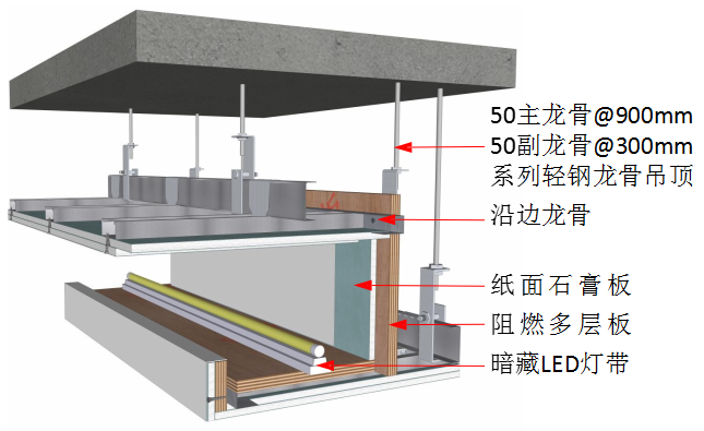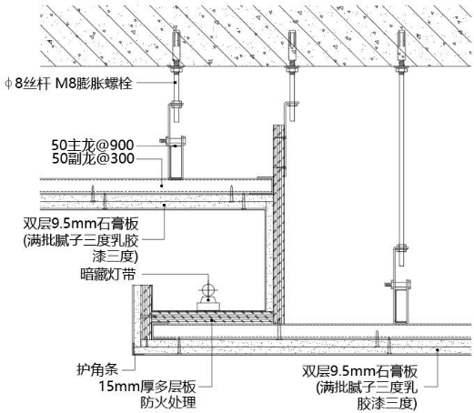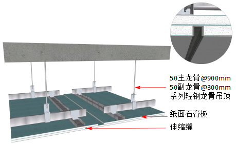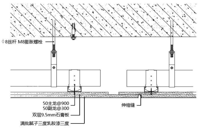 ② 双层石膏板天花需留 10~20mm 伸缩缝(具体以设计为准),交接长度为 30~50mm,伸缩缝边沿至吊杆间距不大于 150mm;