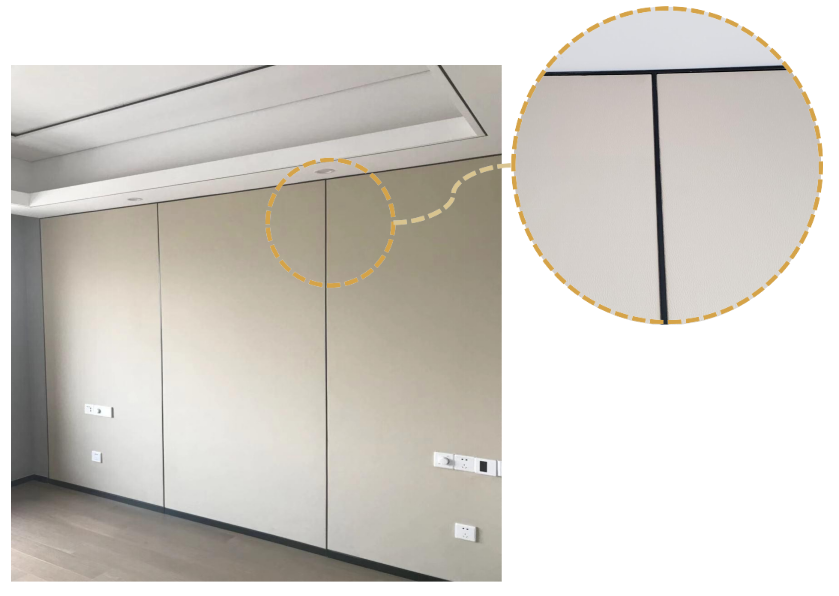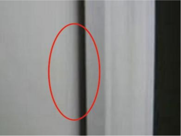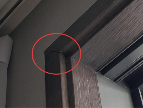 ② 门套线与墙体隙小于 5mm,套线与墙体缝隙用与门套线或墙体相近颜色的中性玻璃胶密封,打胶应均匀顺畅,大于 5mm 的缝隙则需调整门套板和基层;