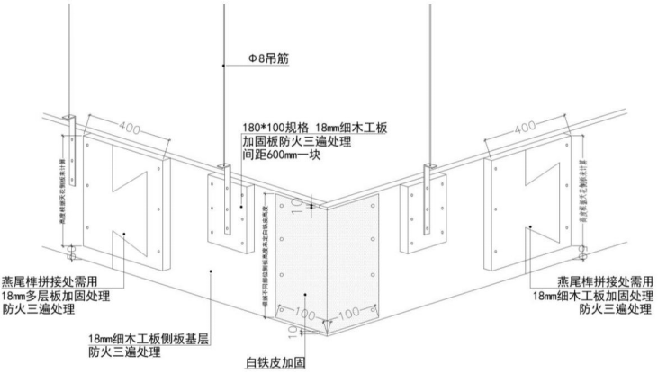 ② 侧板采用 18mm 厚阻燃阻燃板,拼接处需用燕尾榫进行连接,背面采用吊杆加固,吊杆间距不大于 800mm;