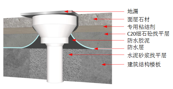 ③ 地漏安装时周边的砂浆应填充密实,地漏安装后表面比地面完成面低 1~2mm;