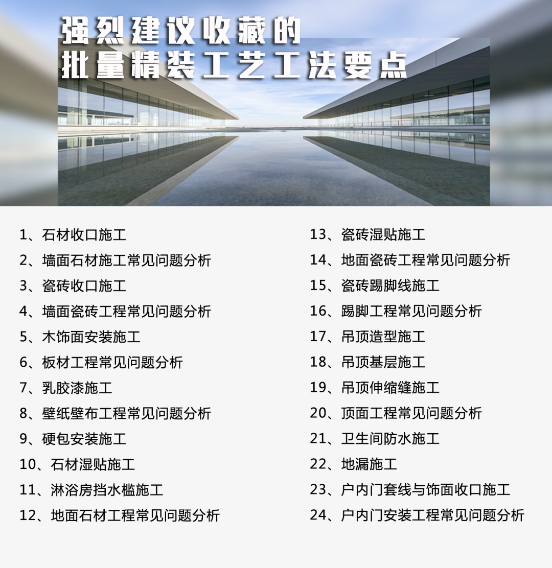 本期给大家分享一组批量精装“工艺工法要点”,供大家学习参考: