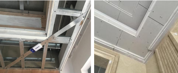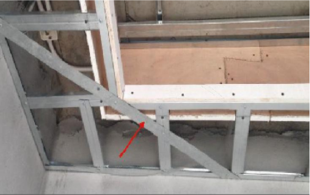 ② 轻钢龙骨之间的连接不牢固,转角部位刚度不足且未进行加固,造成骨架变形,导致顶板不平、开裂。