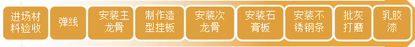 ③ 顶面存在不锈钢装饰条,需在第二层石膏板板面留槽,宽度略大于不锈钢嵌条宽度;将预先加工好的不锈钢U型条用胶固定于三侧石膏板上,不锈钢要顺直平整,并粘接牢固;