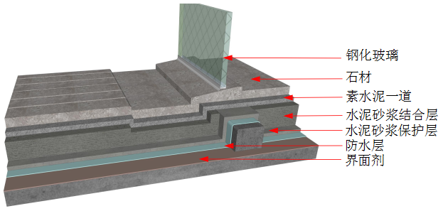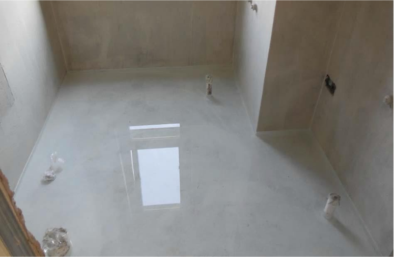 ④ 闭水试验:待防水层完全干后进行24h闭水试验,确认不漏水后进行下道工序。待所有装饰面层完工后做二次闭水试验, 蓄水时间也为24小时;