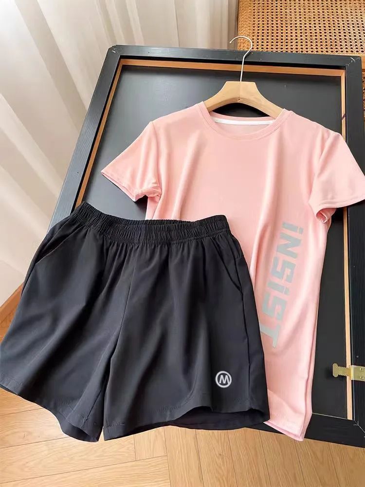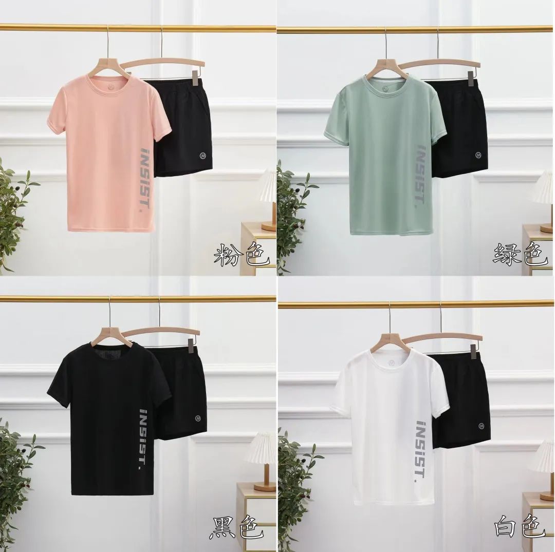 设计的也很巧妙,上衣下裤、正肩圆领的款式,加上纯色加英文拼接的设计,看起来时尚感十足;