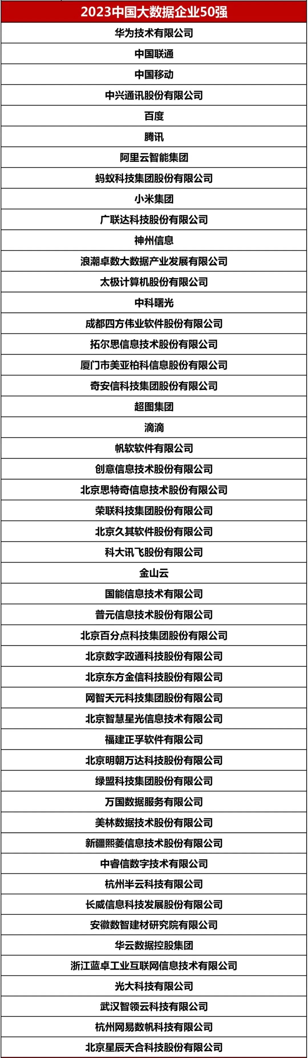 此外,大会还发布了2023中国大数据企业50强,以期充分发挥市场主体的先发优势,助推新兴技术快速发展,加速数据智能向传统行业的渗透。