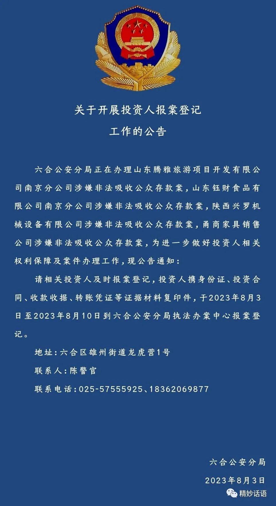 请相关投资人及时报案登记,投资人携身份证、投资合同、收款收据、转账凭证等证据材料复印件,于2023年8月3日至2023年8月10日到六合公安分局执法办案中心报案登记。