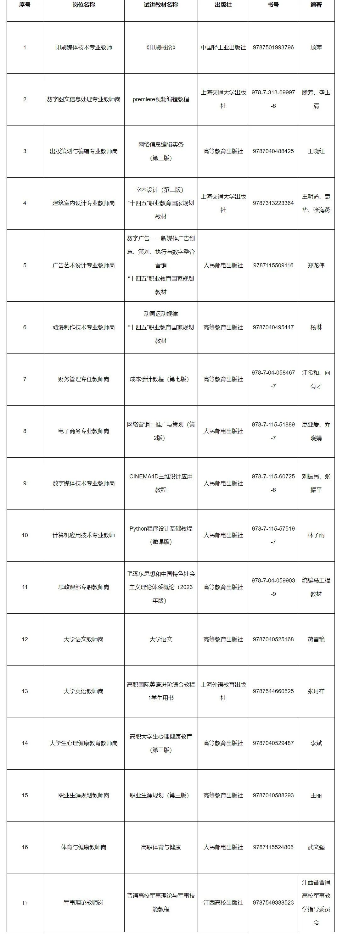 教师岗笔试主要测试所报岗位的相关知识和能力;试讲主要考察应聘者的专业知识基础和教育教学能力,试讲内容为规定教材(如下表),试讲时间为12分钟。