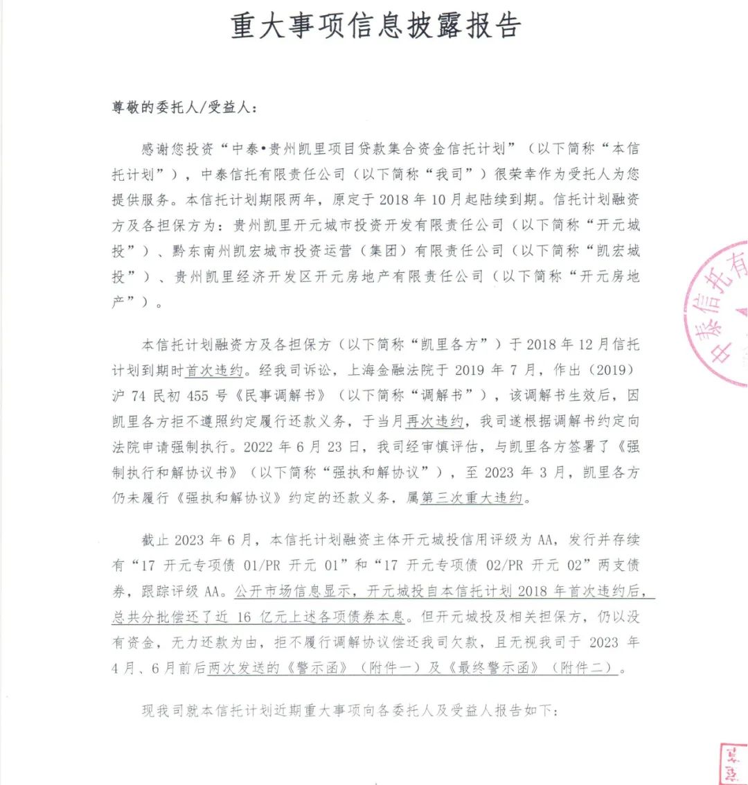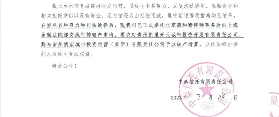 7月28日,中泰信托发布“贵州凯里项目贷款集合资金信托计划重大事项信息披露报告”。城投平台三次违约仍不还款,已正式向上海金融法院递交执行转破产申请,要求对贵州凯里开元城市投资、黔东南州凯宏城投予以破产清算。