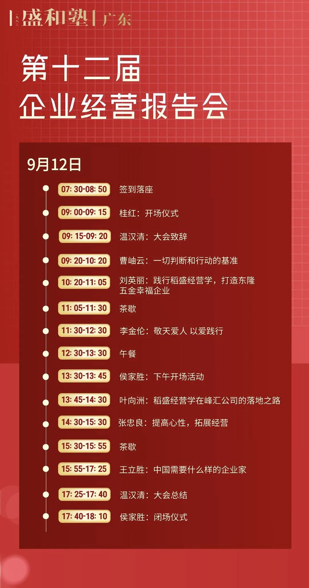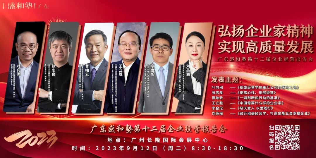 广东盛和塾第十二届企业经营报告会将于9月12日(周二)在广州长隆国际会展中心举办,本次报告会除国内盛和塾资深塾生践行分享外,特邀中国社会科学院哲学研究所王立胜书记,中国盛和塾创始人曹岫云老师莅临分享!