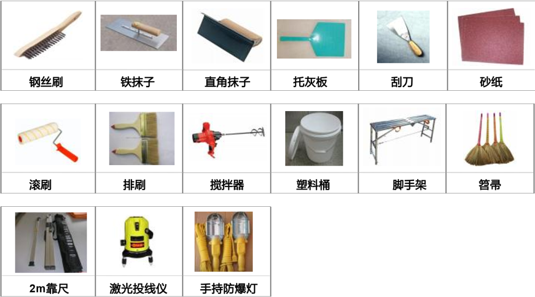 在整个油工施工过程中所需的施工工具包括:钢丝刷、铁抹子、直角抹子、托灰板、刮刀、砂纸、滚刷、排刷、搅拌器、塑料桶、脚手架、扫帚、2M靠尺、激光投线仪、手持防爆灯,所有电动工具必须附有厂家合格证,符合工具的使用要求。