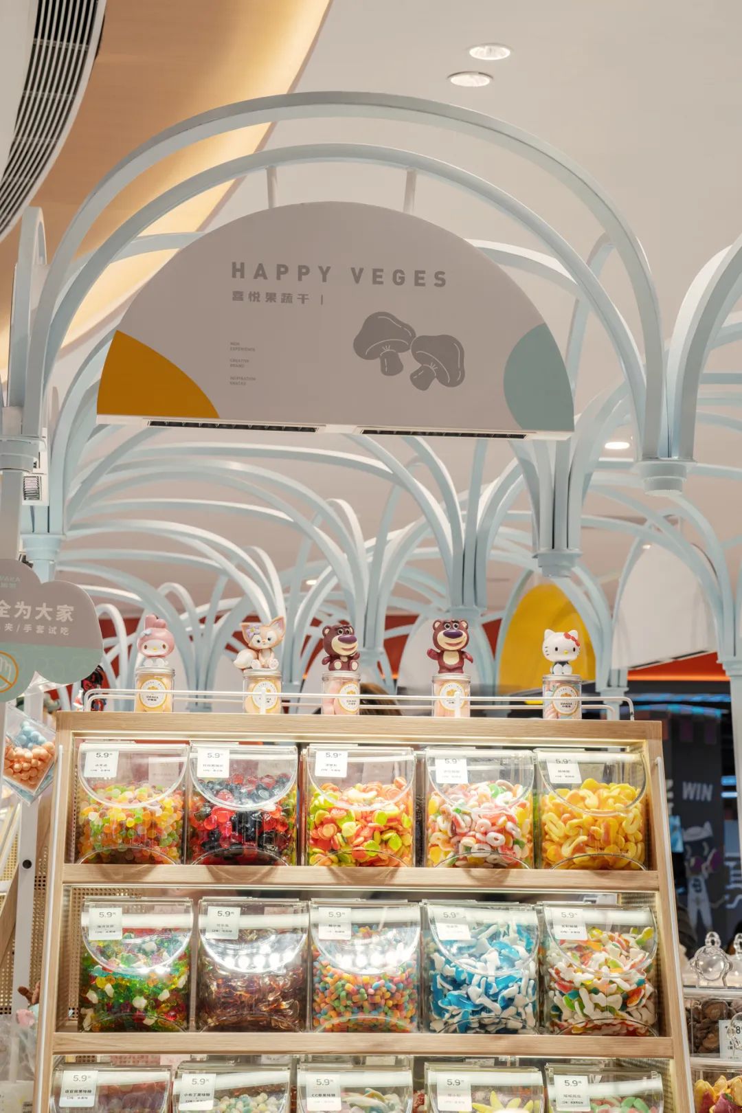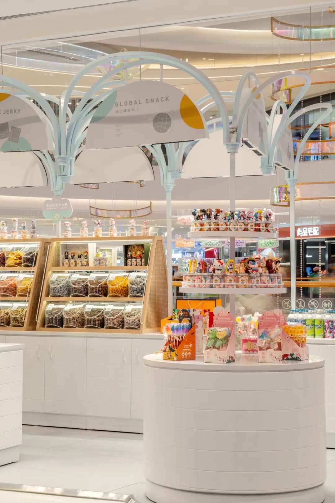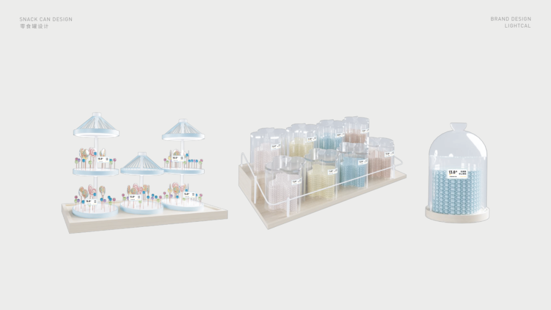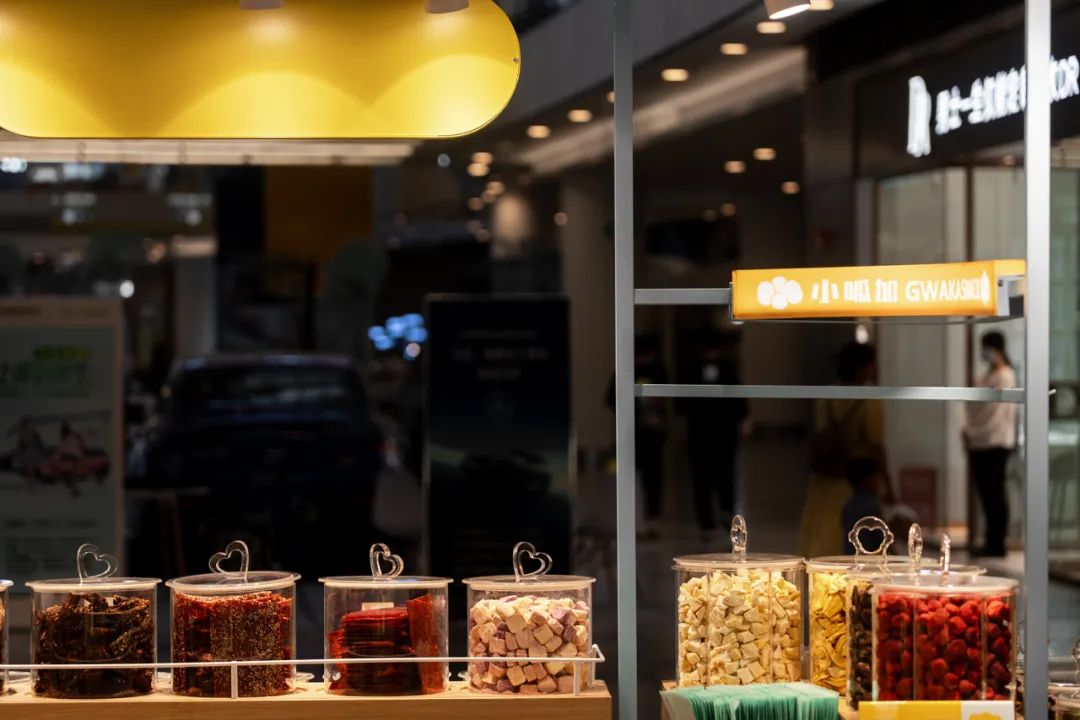 五彩缤纷的零食分区陈列,以看得见的健康、新鲜为主要目的,设计多种不同造型的透明密封容器。丰富的想象力和多重感官的快乐,满足小朋友或大人们儿时对梦幻糖果屋的幻想。