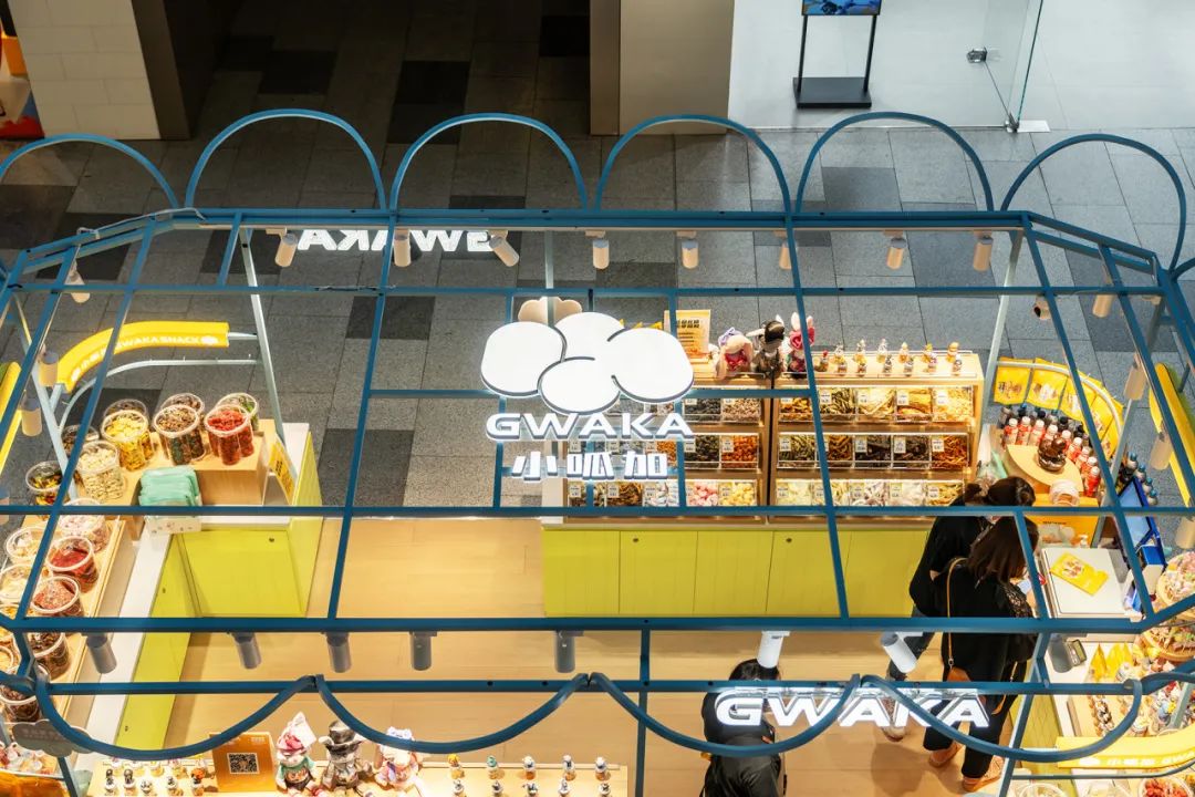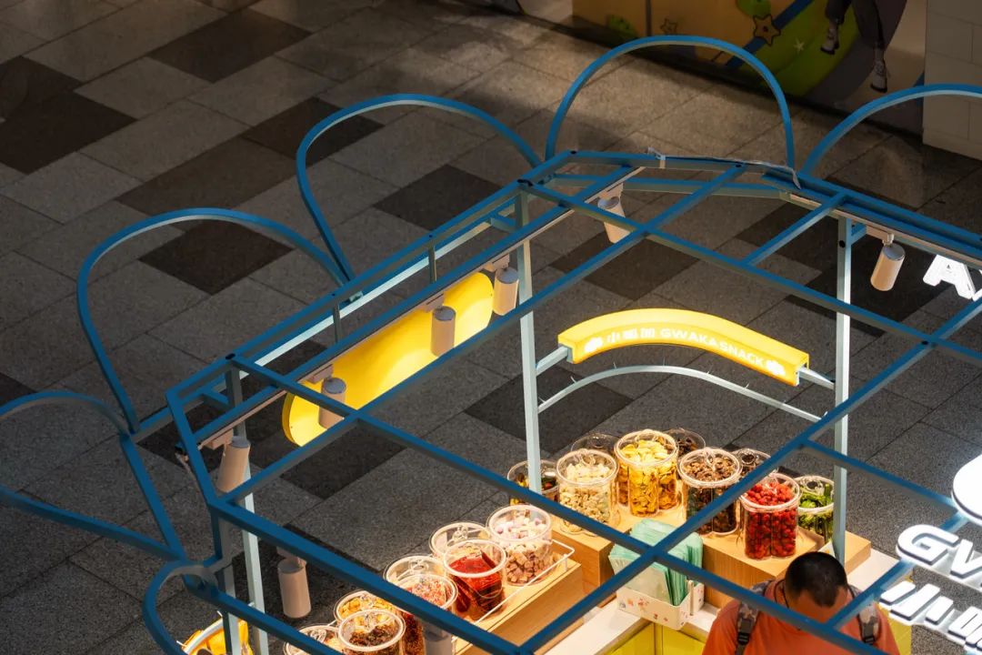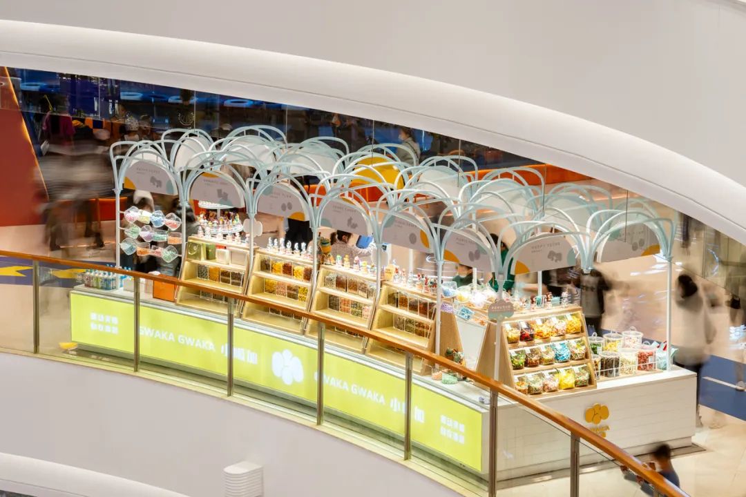 小呱加的店铺都开在人流量较多的购物中心多经点,要与竞品拉开品质与差异化,店面设计成为突破点。以更新鲜的事物、更有故事性、更丰富的场景、造型、颜色、灯光照明等,第一时间抓住消费者的眼球。