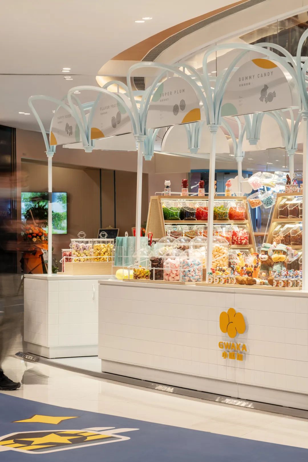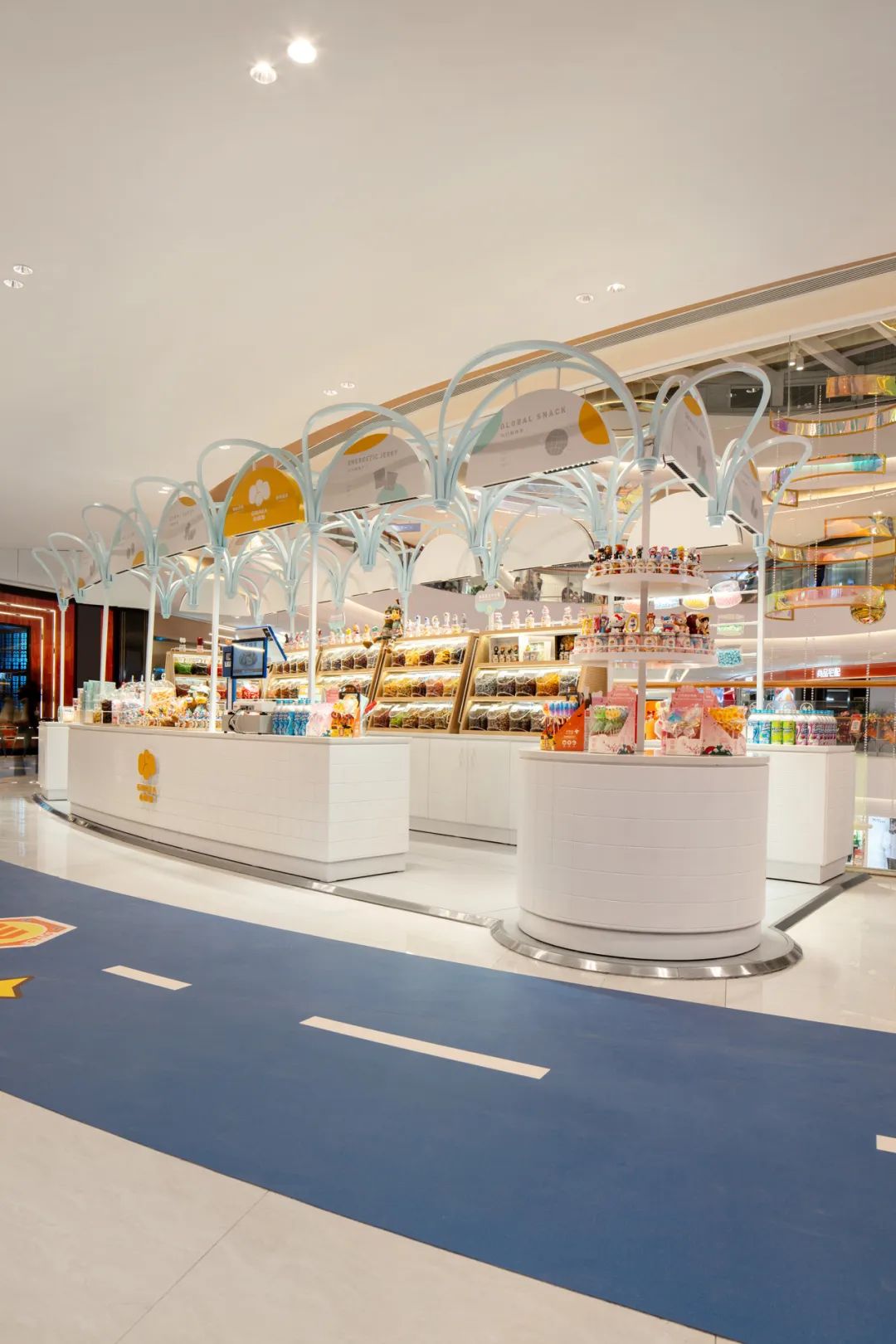 店面设计的想象同样从一颗Q弹的橡皮糖开始,像儿童画一般将它拉伸成“花朵”的形态。创造有形有趣、又充满时尚感的零食乐园。独特的造型也将灯光创造性的隐藏起来。缪斯蓝和静雅白的渐变色彩,令人毫无防备地被治愈!