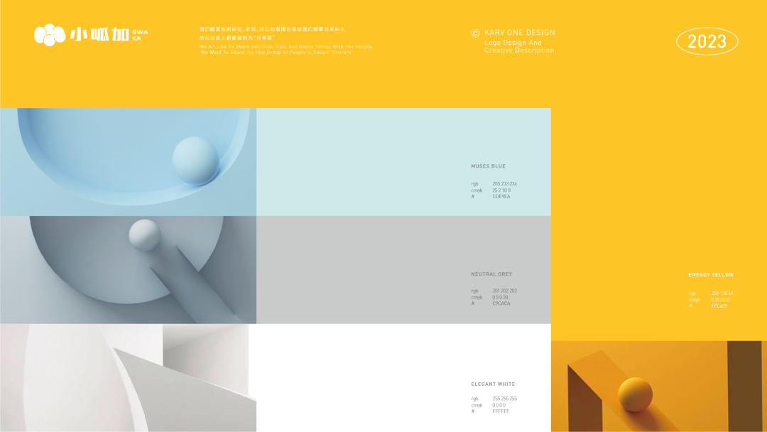 自然界中阳光以及天然果蔬色彩的活力黄作为主色彩,充满活力,唤起人们乐观和积极情绪。辅助色缪斯蓝、中性灰、静雅白的加入带来创造力、欢乐、柔和、清新,打动眼睛,产生美好的味觉联想。