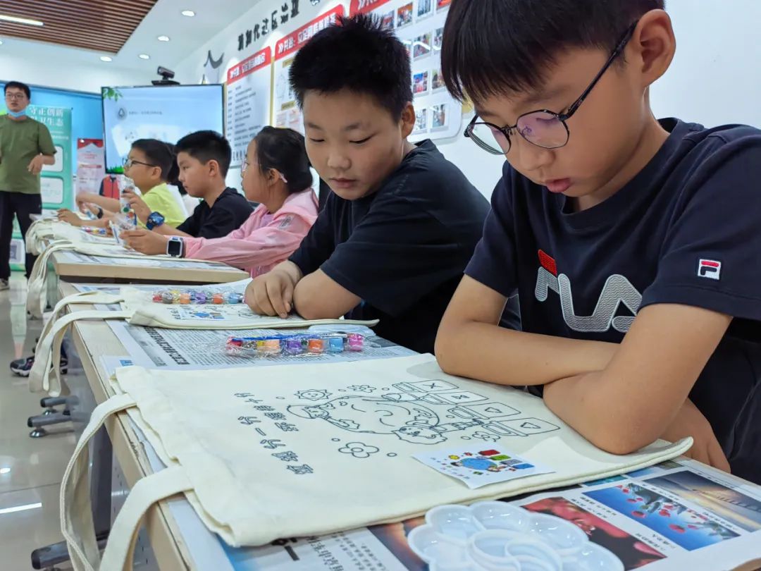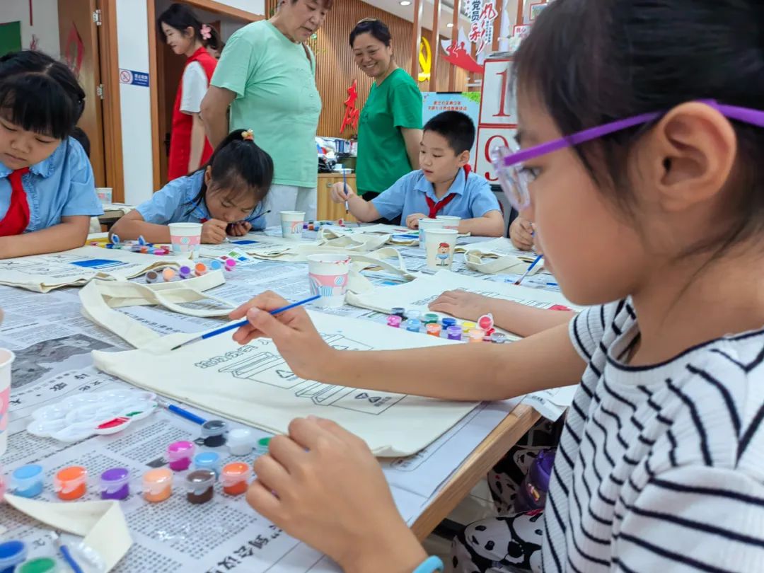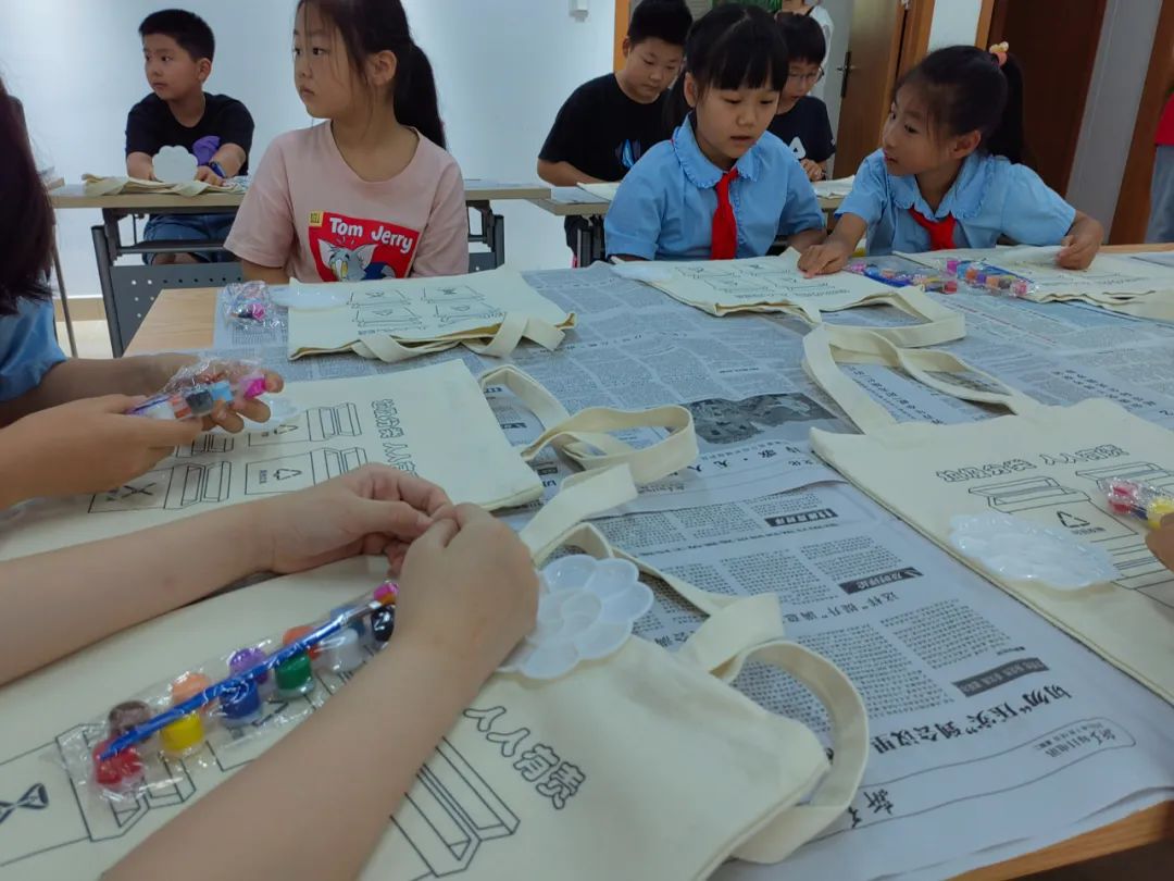 随后,文旅小青柠和学生们在社区工作人员的带领下移步社区活动室,开展“手绘环保布袋”的活动。