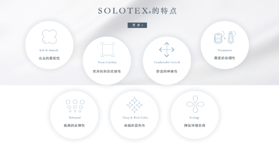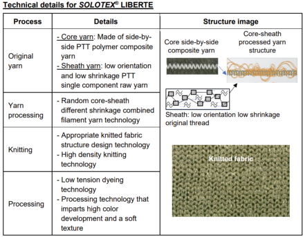 Solotex Liberte 使用販對苯二甲酸丙二醇醋(PTT) 纖維,該纖維採獨特的加工方法,最大限度地提高PTT的性能,同時控制原紗的熱收縮性。布料質地柔軟,表面光滑,同時提供鮮豔的色彩和奢華的光澤。採用 Solotex Liberte 製成的服装因其柔軟的彈力、輕量及速乾等特性而大大提升穿著舒適度。