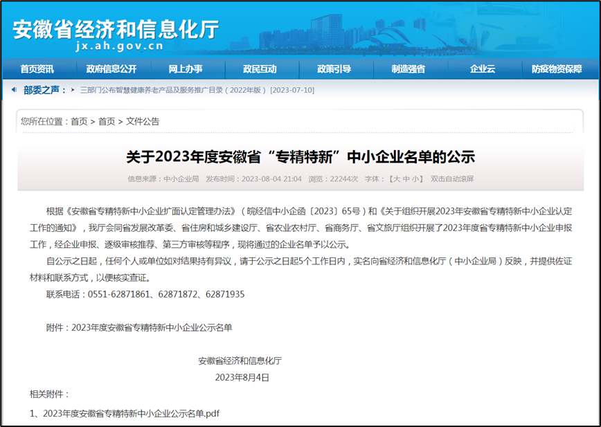 2023年8月4日,安徽省经济和信息化厅公布2023年度省专精特新中小企业名单。金屹集团旗下的安徽金屹能源发展有限公司和黄山金屹云智科技有限公司均成功通过认证。
