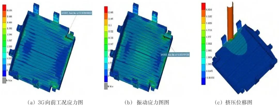图 7(c)挤压最大位移7.081 mm,电池模组安全距离为10mm(每个电池包结构不同,安全距离也会不同,需要客户确认),满足要求。