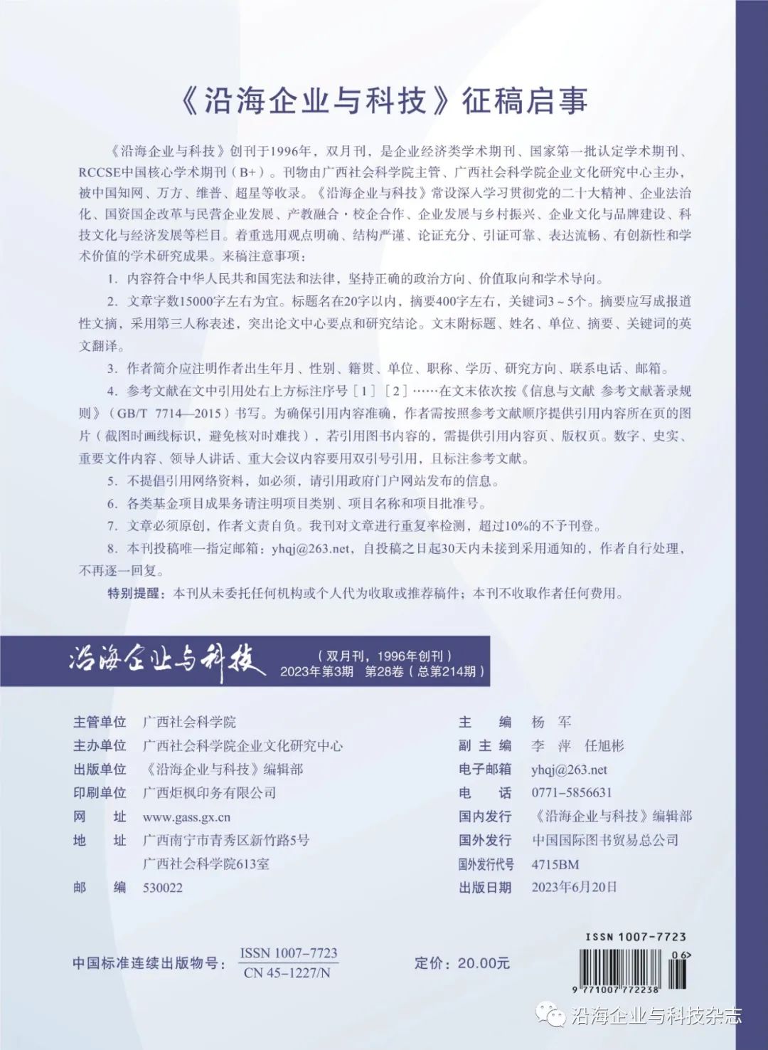 《沿海业与科技》创刊于1996年,双月刊,是企业经济类学术期刊、国家第一批认定学期刊、RCCSE中国核心学术期刊(B+)。刊物由广西社会科学院主管、广西社会科学院企业文化研究中心主办,被中国知网、万方、维普、超星等收录。往期刊载文章中,多篇被中国人民大学复印报刊资料等重要刊物转载。