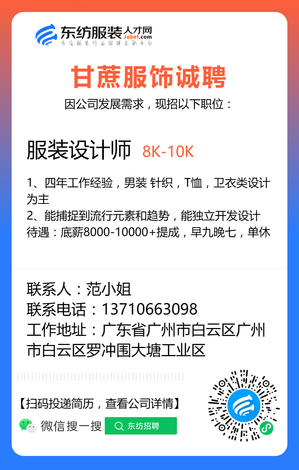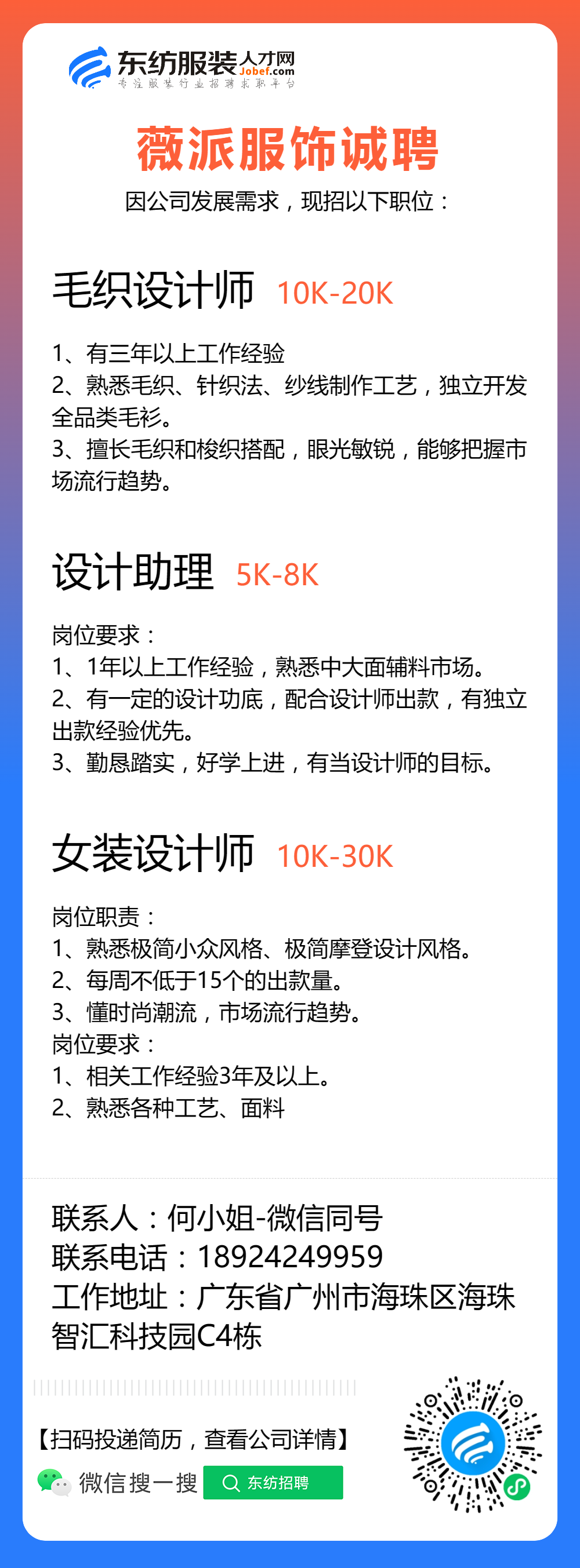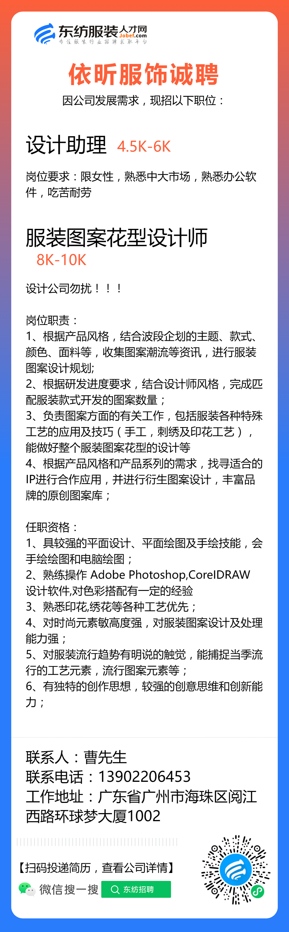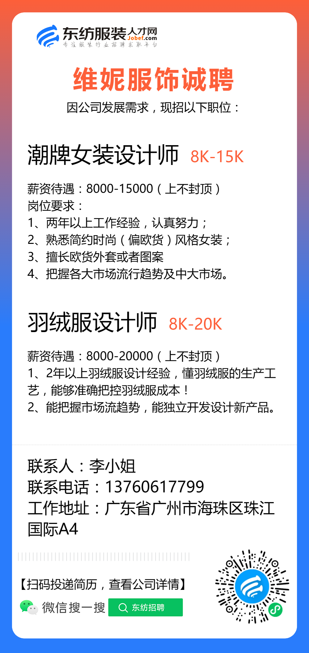 服装招聘·设计类丨8. 6 号,女装设计师、男装设计师、童装设计师、设计助理.....