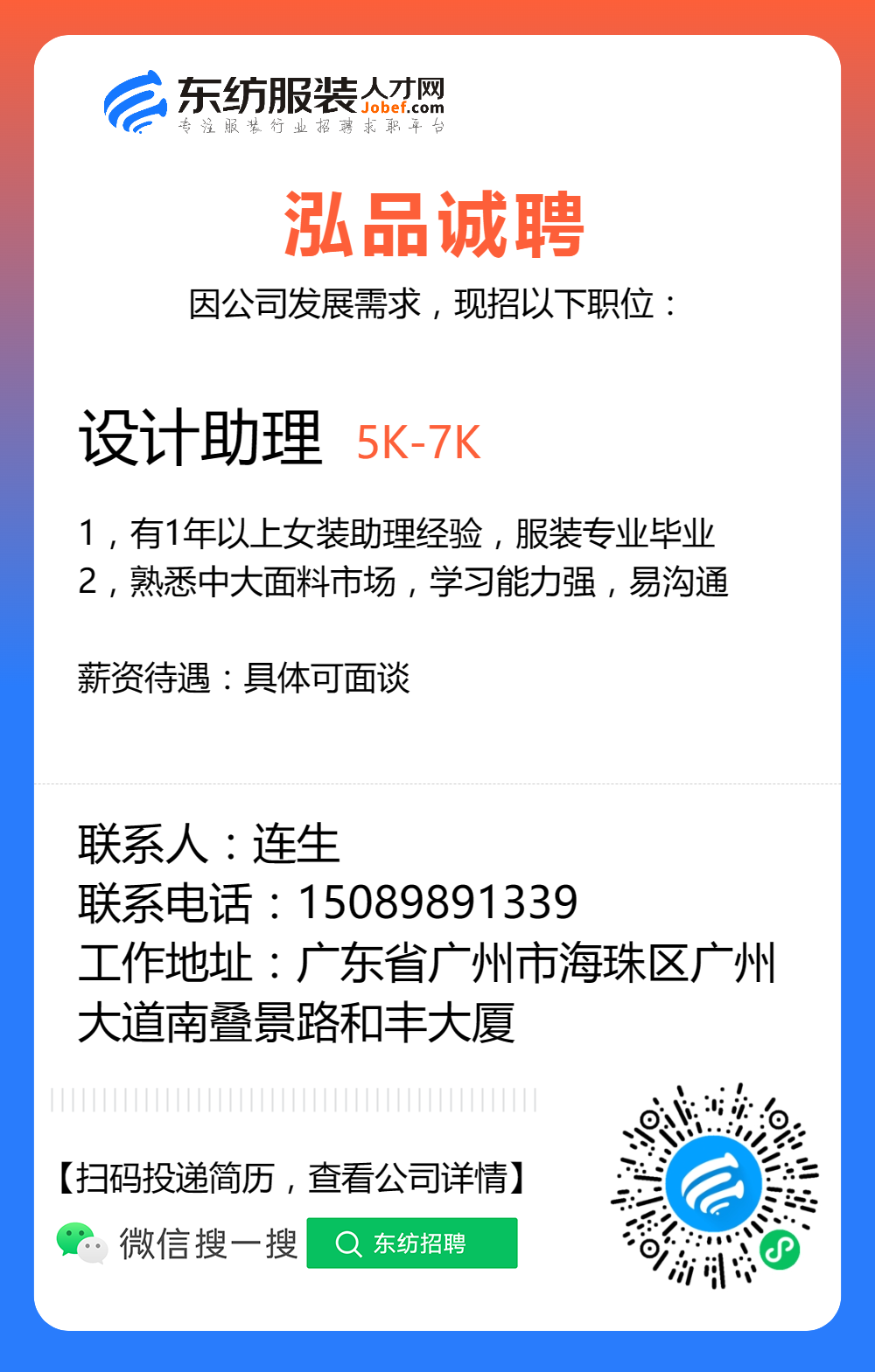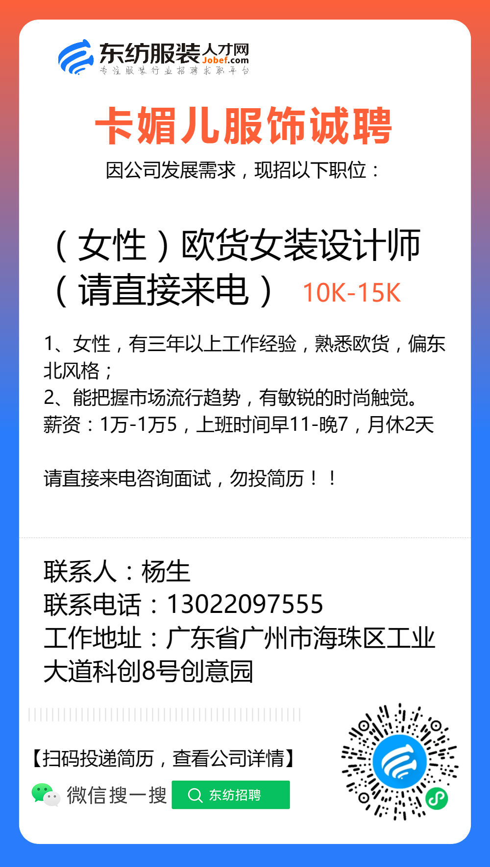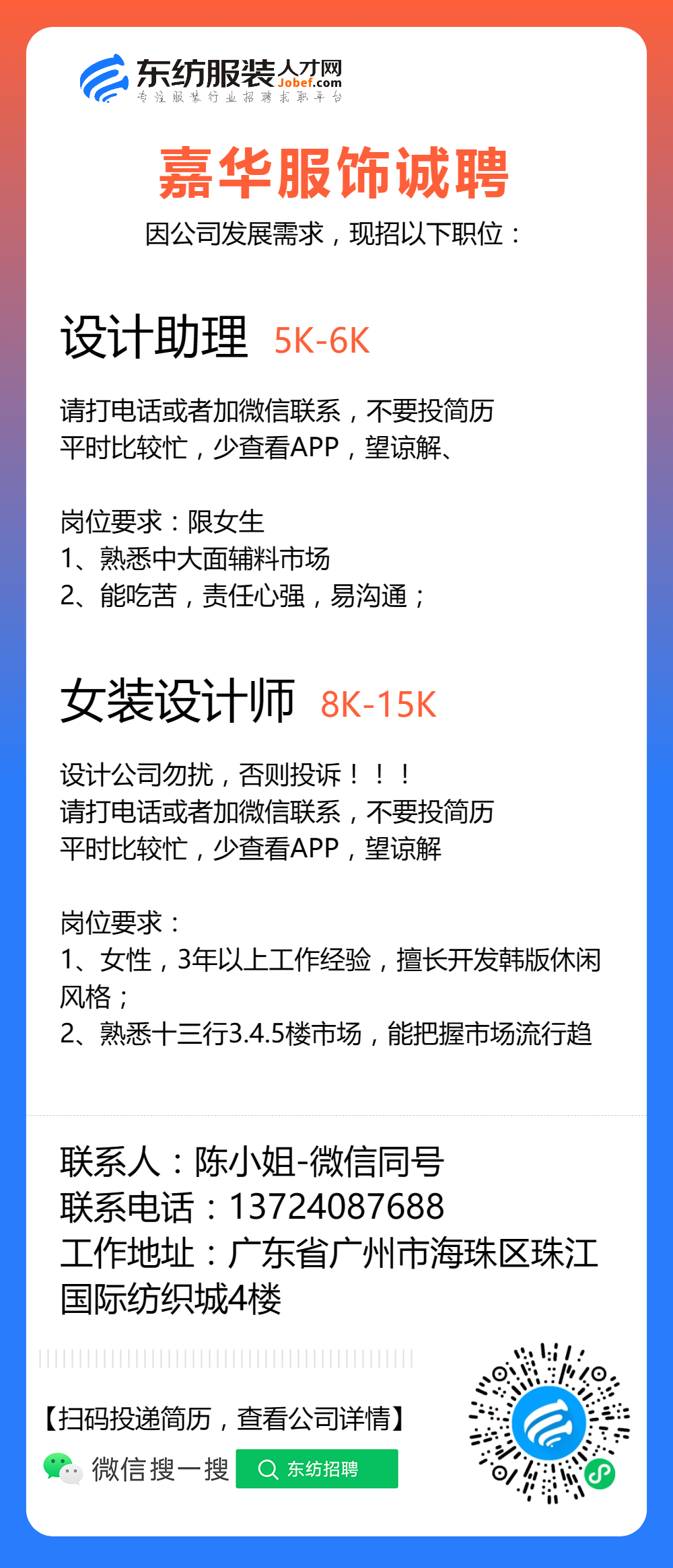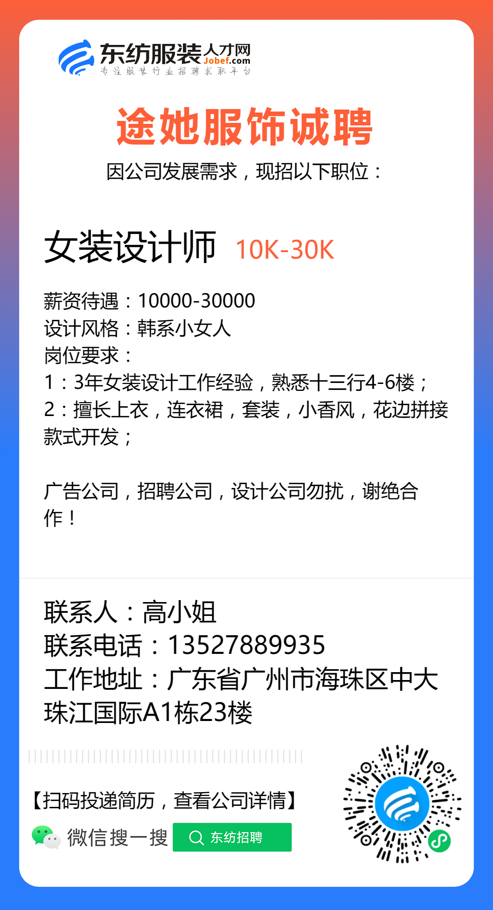 服装招聘·设计类丨8. 6 号,女装设计师、男装设计师、童装设计师、设计助理.....