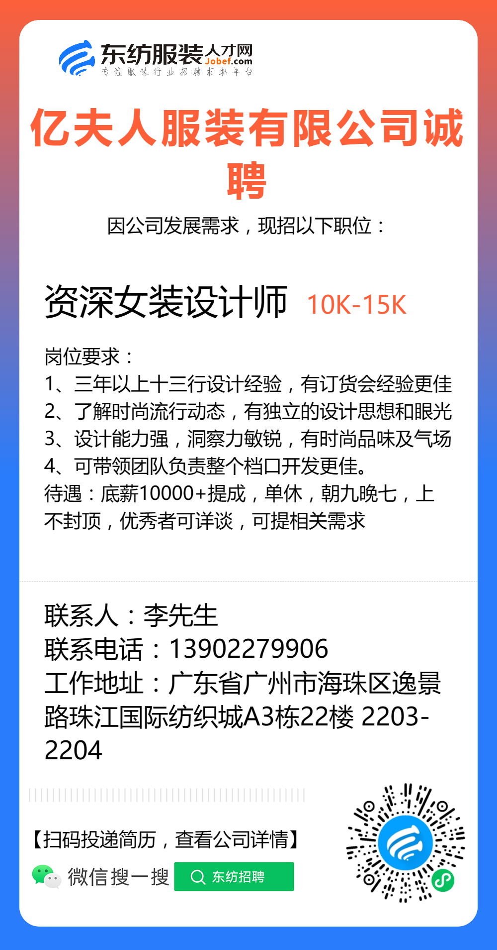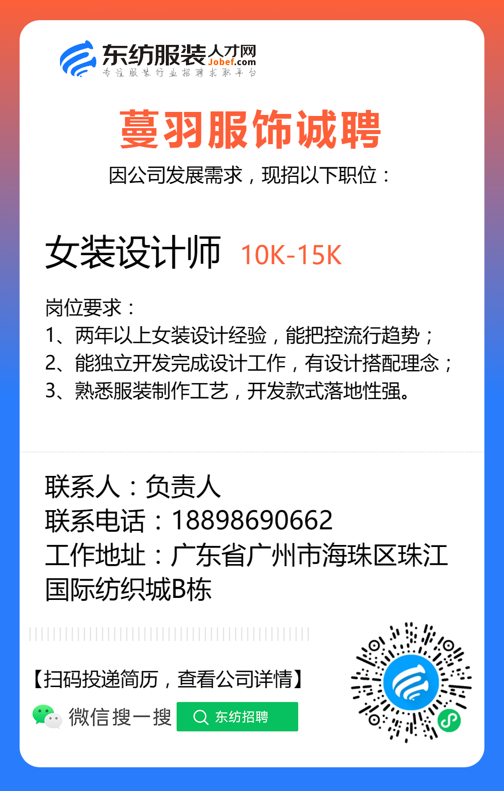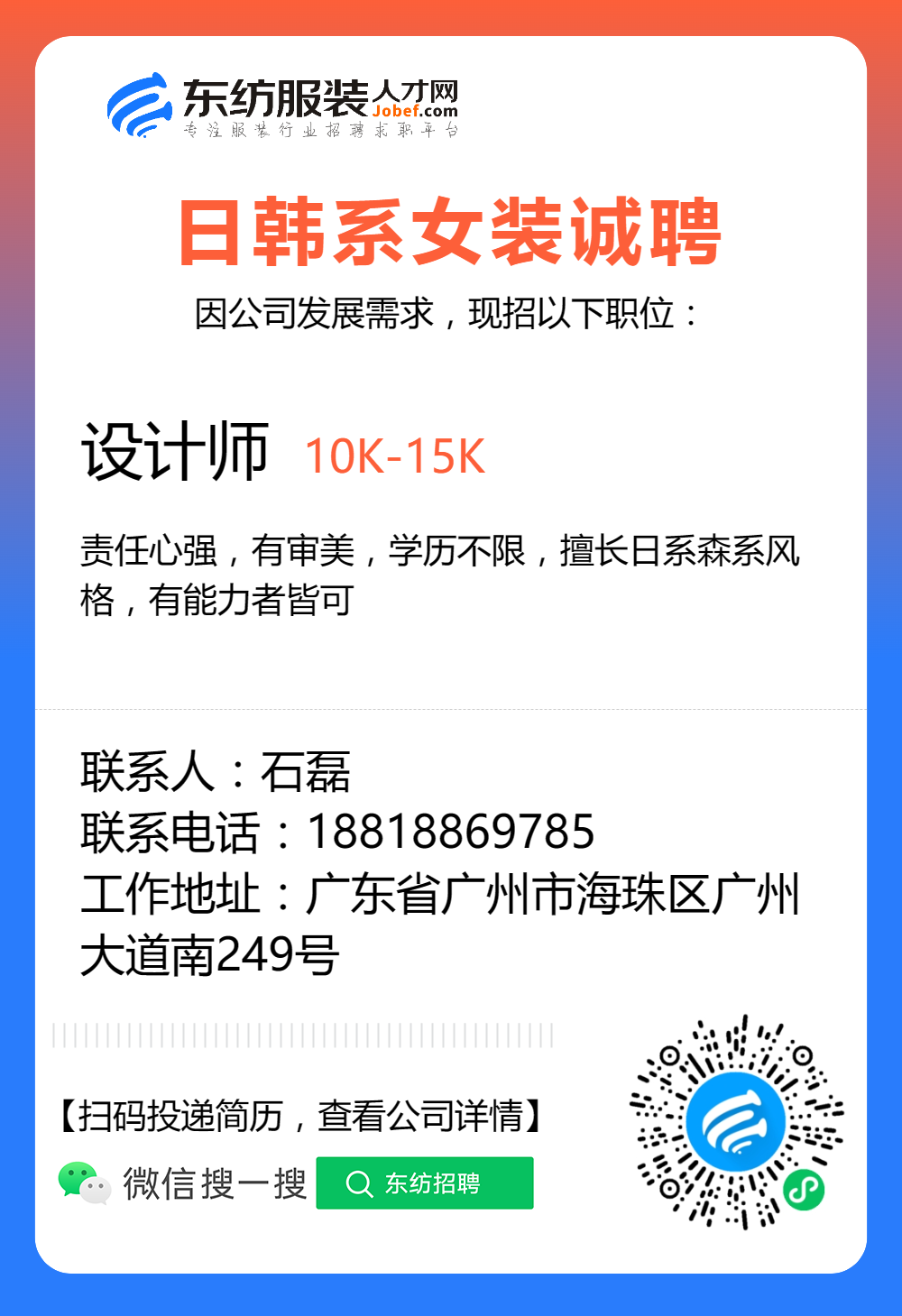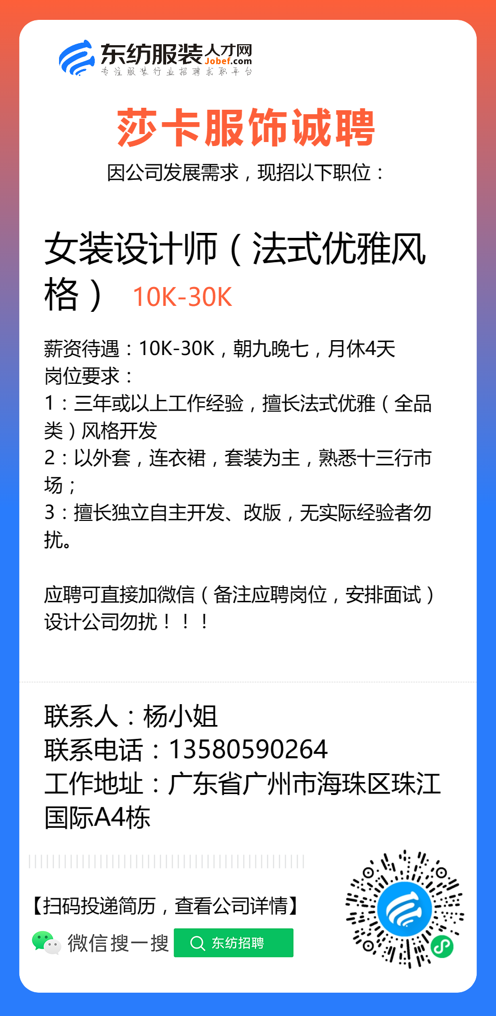 服装招聘·设计类丨8. 6 号,女装设计师、男装设计师、童装设计师、设计助理.....