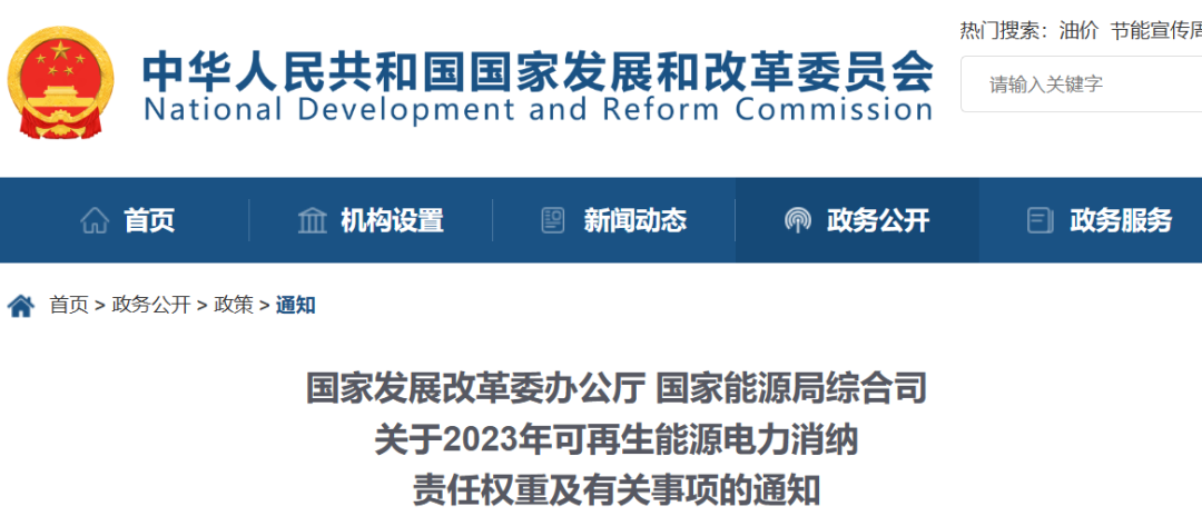 各省、自治区、直辖市、新疆生产建设兵团发展改革委、能源局,天津市、辽宁省、上海市、重庆市、四川省、甘肃省经信委(工信委、工信厅),国家能源局各派出机构,国家电网有限公司、中国南方电网有限责任公司、内蒙古电力(集团)有限责任公司,电力规划设计总院、水电水利规划设计总院:为助力实现碳达峰、碳中和目标,加快规划建设新型能源体系,推动可再生能源高质量发展,根据《国家发展改革委、国家能源局关于建立健全可再生能源电力消纳保障机制的通知》(发改能源〔2019〕807号),现将2023年可再生能源电力消纳责任权重和2024年预期目标印发给你们,并就有关事项通知如下。一、2023年可再生能源电力消纳责任权重为约束性指标,各省(自治区、直辖市)按此进行考核评估;2024年权重为预期性指标,各省(自治区、直辖市)按此开展项目储备。2023年各省(自治区、直辖市)可再生能源电力消纳责任权重见附件1,2024年各省(自治区、直辖市)预期目标见附件2。二、各省(自治区、直辖市)按照非水电消纳责任权重合理安排本省(自治区、直辖市)风电、光伏发电保障性并网规模。严格落实西电东送和跨省跨区输电通道可再生能源电量占比要求,2023年的占比原则上不低于2022年实际执行情况。三、各省级行政区域可再生能源电力消纳责任权重完成情况以实际消纳的可再生能源物理电量为主要核算方式,各承担消纳责任的市场主体权重完成情况以自身持有的可再生能源绿色电力证书为主要核算方式,绿证核发交易按有关规定执行。四、各省级能源主管部门会同经济运行管理部门要切实承担牵头责任,按照消纳责任权重积极推动本地区可再生能源电力建设,开展跨省跨区电力交易,制定本行政区域可再生能源电力消纳实施方案,切实将权重落实到承担消纳责任的市场主体。2024年2月底前,向国家发展改革委、国家能源局报送2023年可再生能源电力消纳责任权重完成情况。五、各电网企业要切实承担组织责任,密切配合省级能源主管部门,按照消纳责任权重组织调度、运行和交易等部门,认真做好可再生能源电力并网消纳、跨省跨区输送和市场交易。2024年1月底前,国家电网、南方电网所属省级电网企业和内蒙古电力(集团)有限责任公司向省级能源主管部门、经济运行管理部门和国家能源局相关派出机构报送2023年本经营区及各承担消纳责任的市场主体可再生能源电力消纳量完成情况。六、国家能源局各派出机构要切实承担监管责任,积极协调落实可再生能源电力并网消纳和跨省跨区交易,对监管区域内消纳责任权重完成情况开展监管。2024年2月底前,向国家发展改革委、国家能源局报送2023年监管情况。国家发展改革委、国家能源局将组织电规总院、水电总院、国家发展改革委能源研究所等单位按月跟踪监测各省级行政区域可再生能源电力建设进展及消纳利用水平,按年度通报各省级行政区域消纳责任权重完成情况。附件: