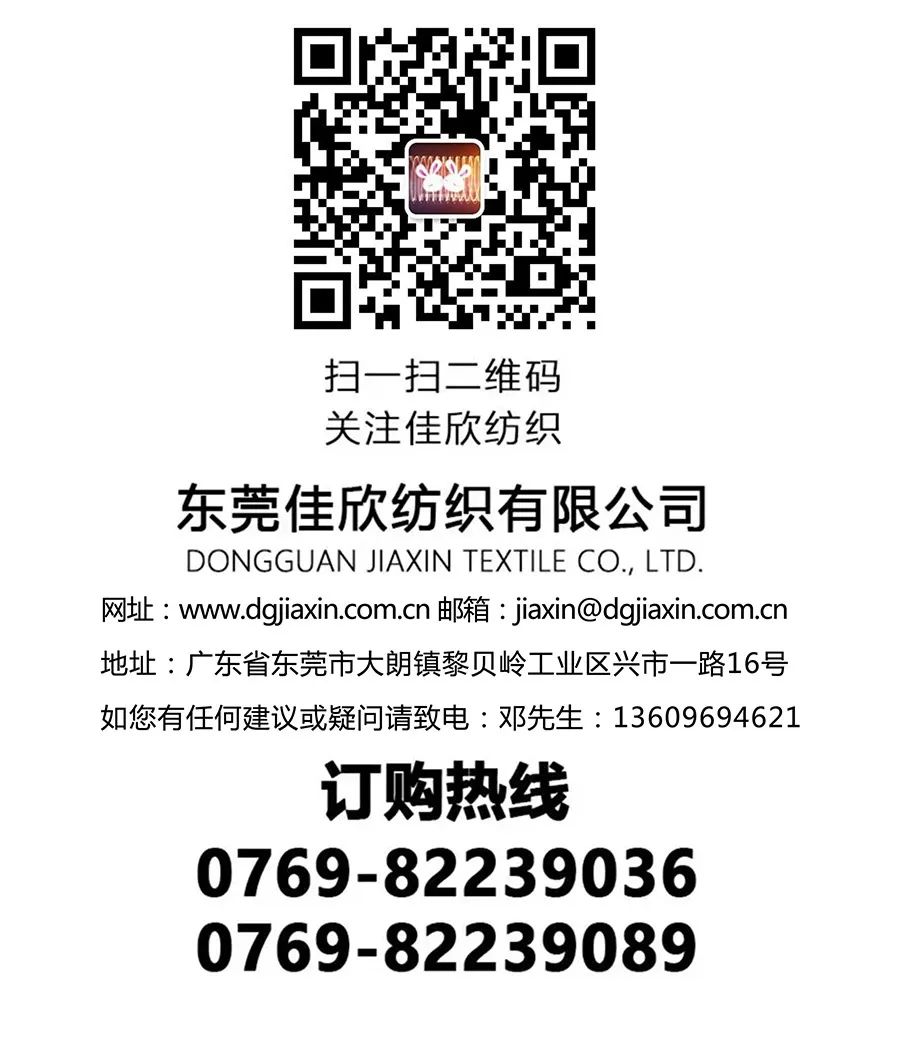 东莞市佳欣纺织有限公司:地处中国毛织重镇——广东省东莞市大朗镇黎贝岭工业区兴市一路16号。是一家经营中高端纺织,针织面料的私营企业.通过多年的努力,现集纺纱,织造,染整于一体。设备配套齐全,在多年的经营过程中,以客户为中心,以多品种,高品质.高质量保证要求,及售后服务的态度,得到远在海外的以及全国各地客商信赖与支持,和共创利润,迅速发展辉煌明天。