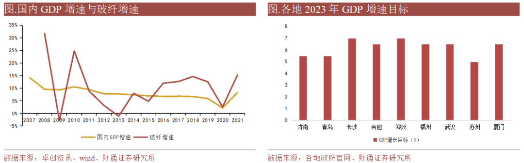 看2023 年我国经济增长情况,近期多个城市及地区公布 2023 年经济增长目标,其生产总值目标增速最低为 5%,绝大部分城市目标增速在 6.5%-7.5%之间,GDP增速的高增,也有望带来各行业景气的回归,从而提振玻纤需求。