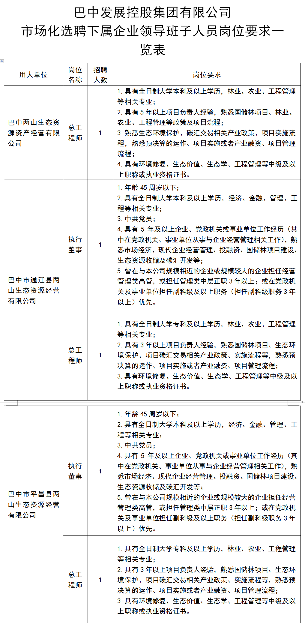 (一)巴中两山生态资源资产经营有限公司总工程师1名;